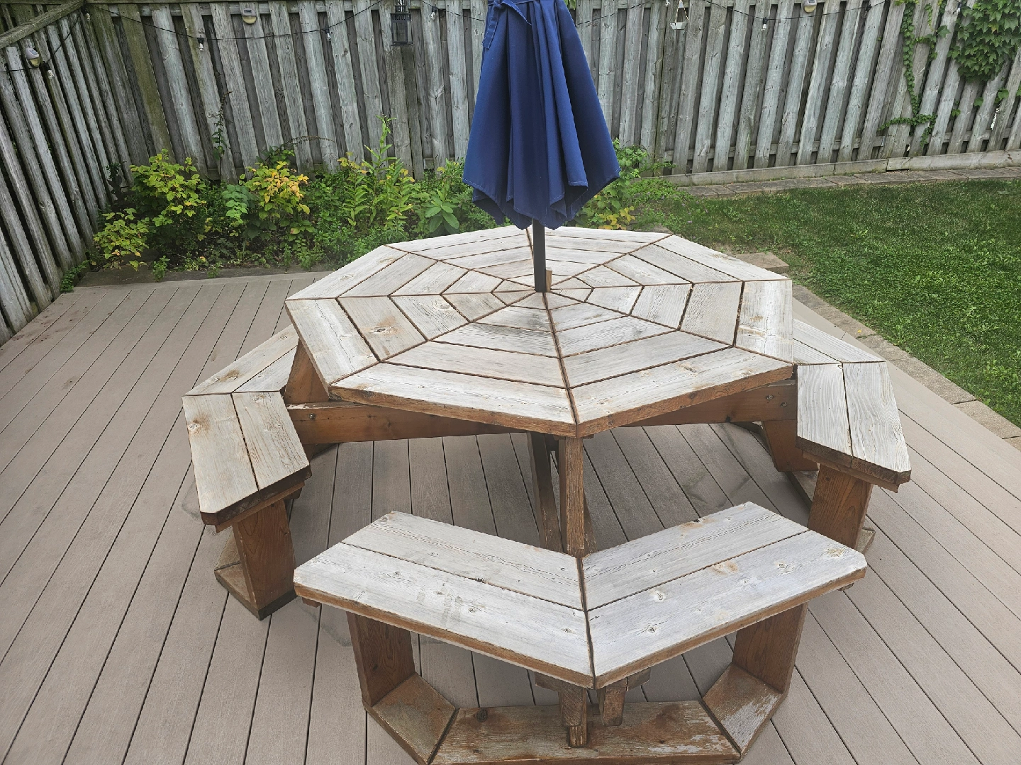 Selling a charming wooden picnic table, perfect for enjoying those sunny days in the backyard! Seats 8 comfortably. A great addition to any outdoor space! *Umbrella not included*
