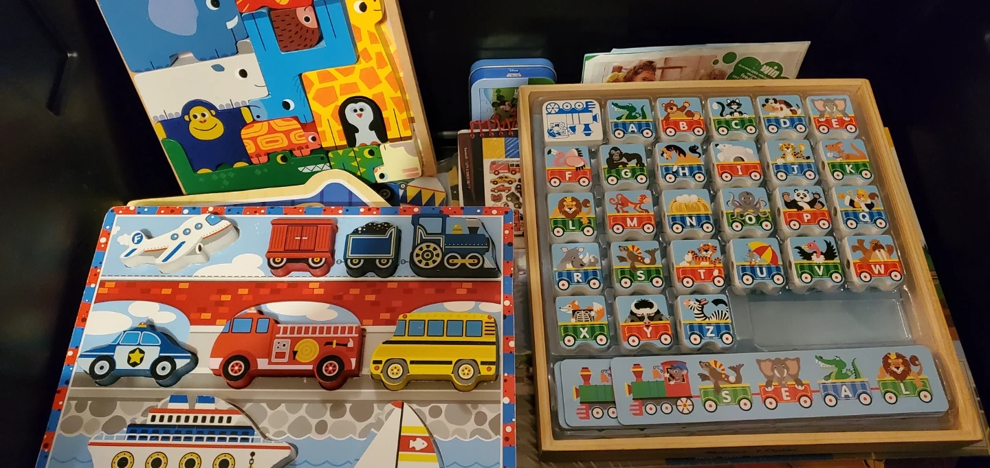 I'm selling a set of wooden puzzles. One is an alphabet train set with animal pictures, and the other is a vehicle puzzle with different types of transportation like a plane, train, and boat. Great for kids!
