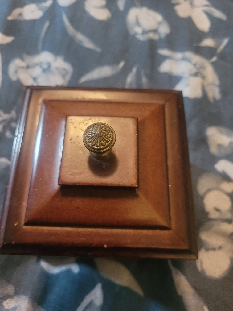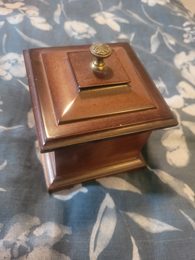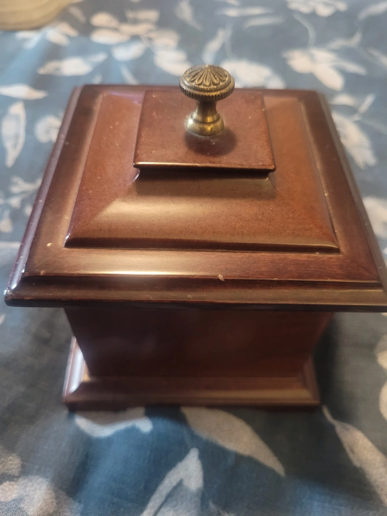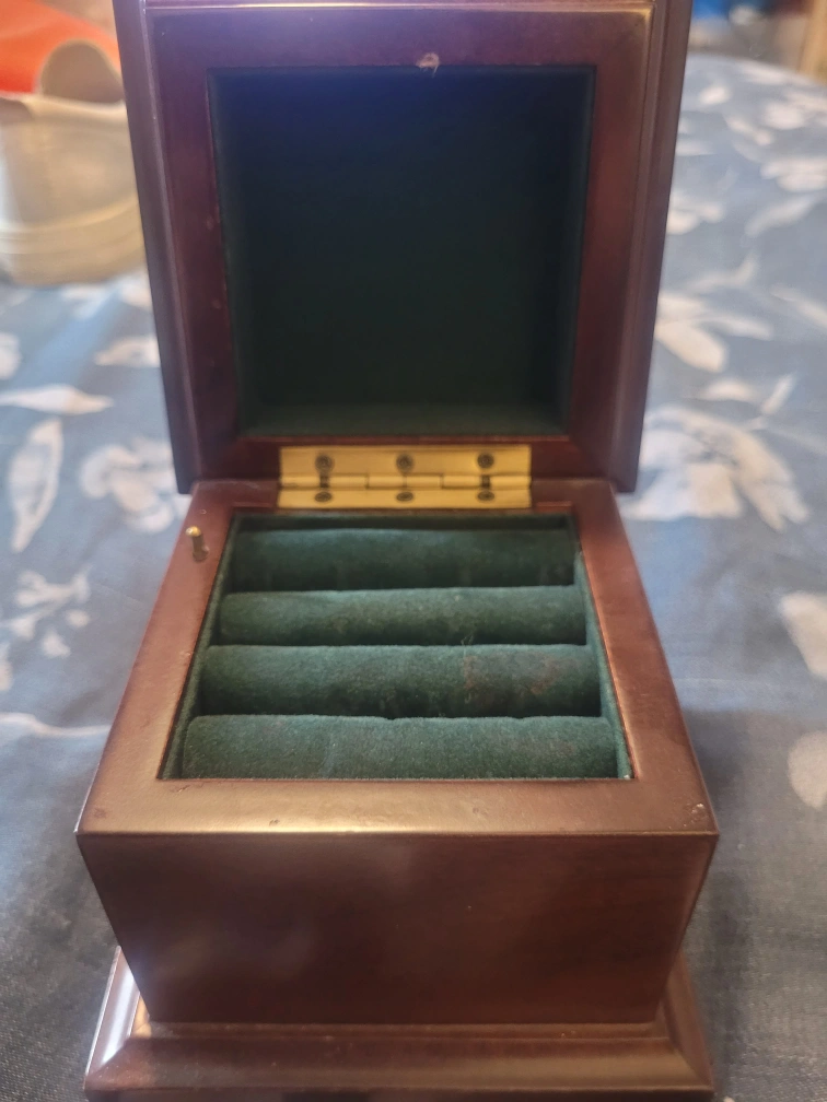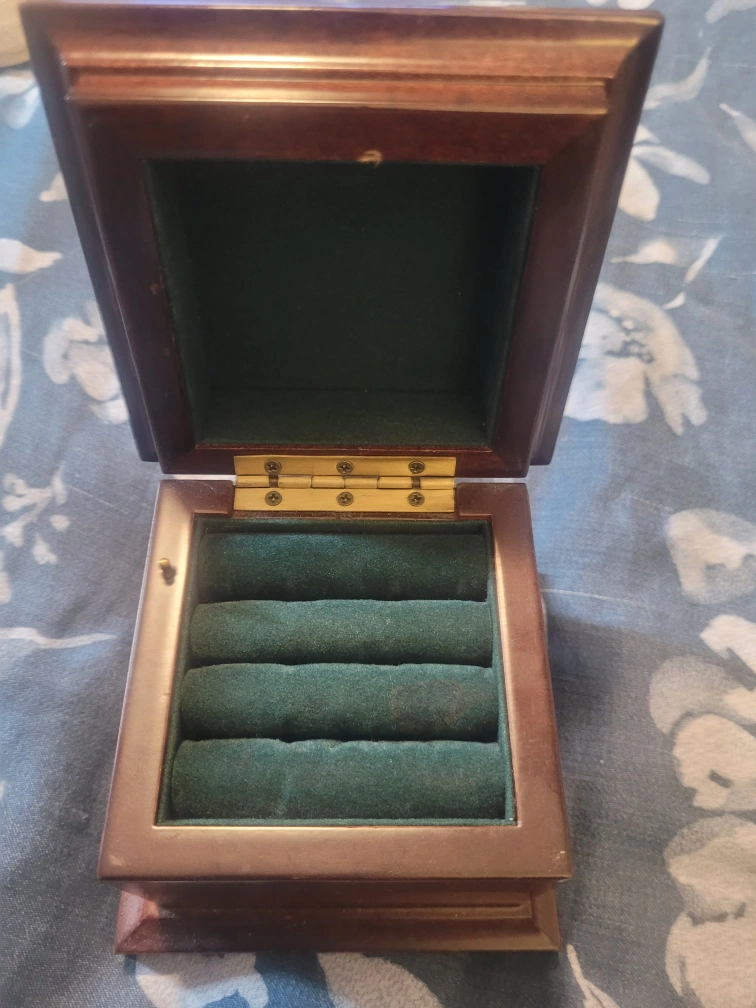 Wooden ring box in good condition. Plays music. Originally from Bombay Company.