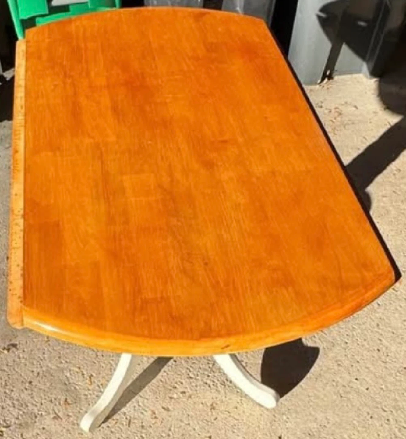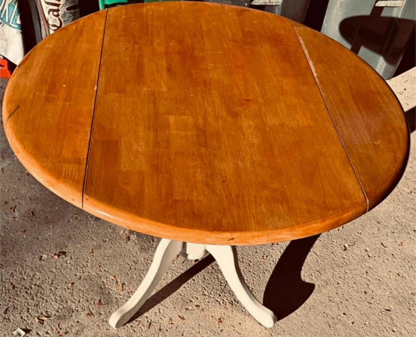 79Selling a wooden round drop leaf table. It has a light wood finish on the top and white wood base. It's in good condition and would be perfect for a small space. Table diameter : 40 inches Height : 30 inches