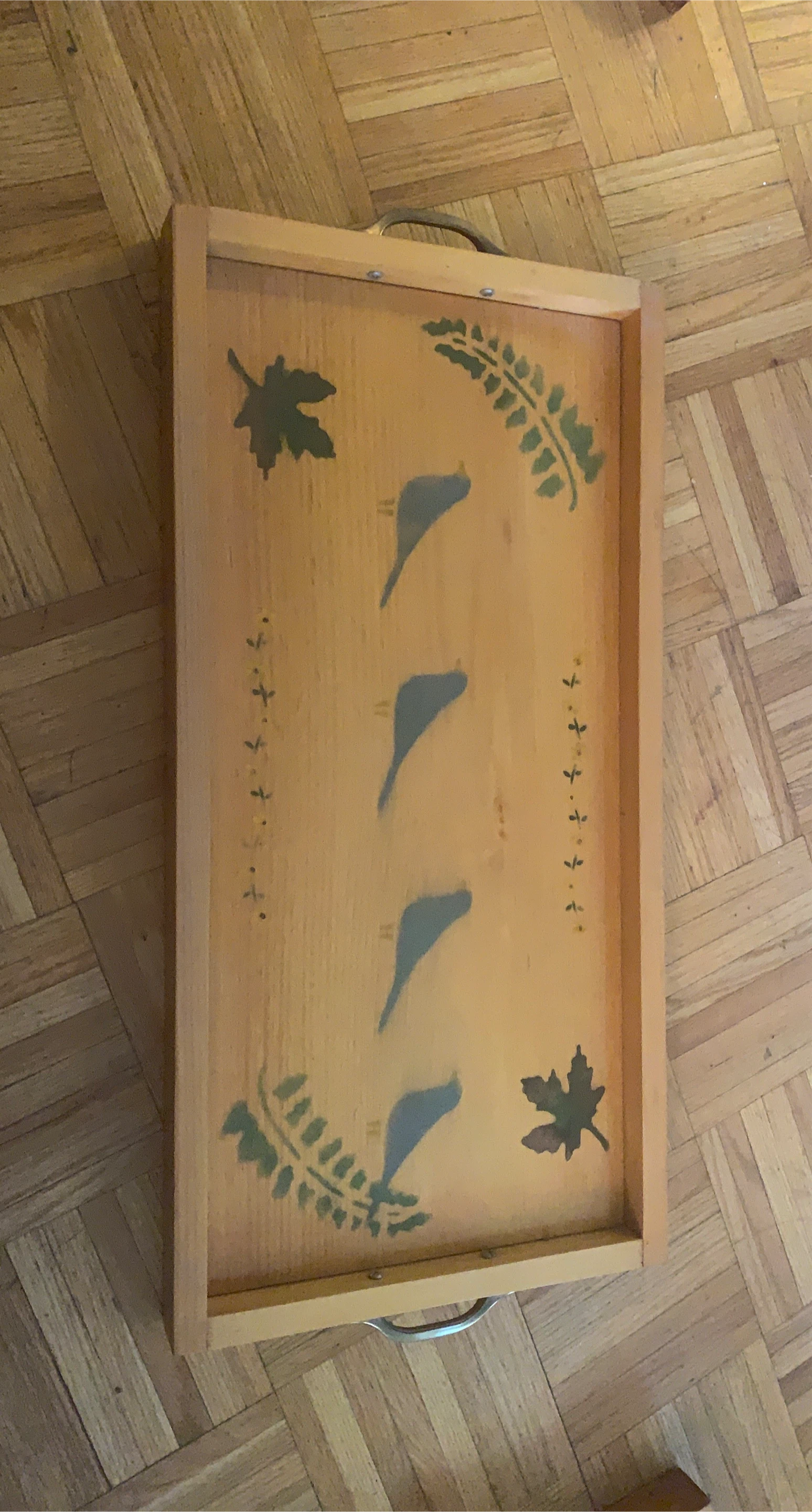 38A lovely wooden serving tray featuring a charming bird and leaf design. It has metal handles on each end. Perfect for serving snacks or drinks, or as a decorative piece for your home