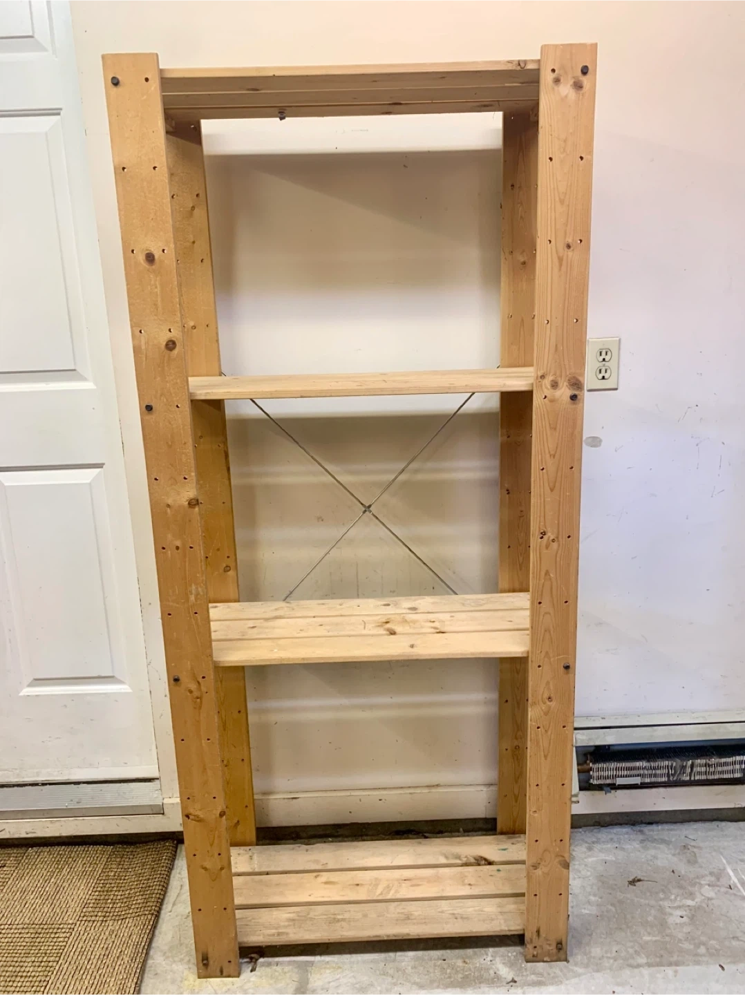 Selling a simple wooden shelf unit with three tiers. It's perfect for organizing items in a garage, basement, or storage room. The shelf is sturdy and in good condition
