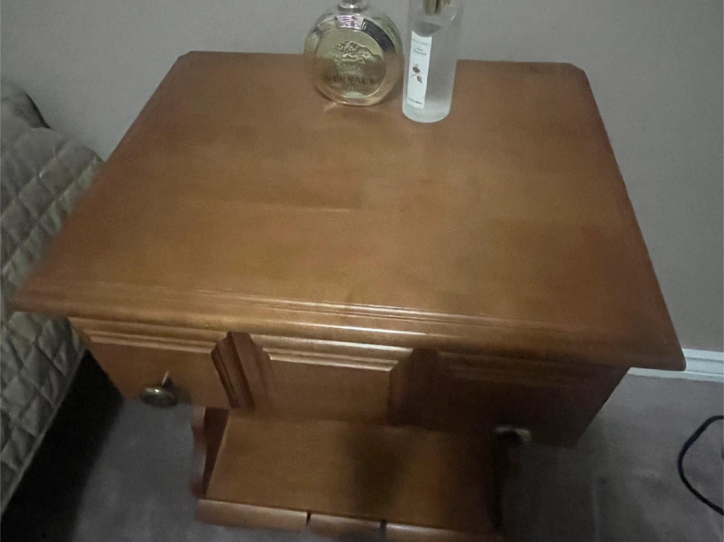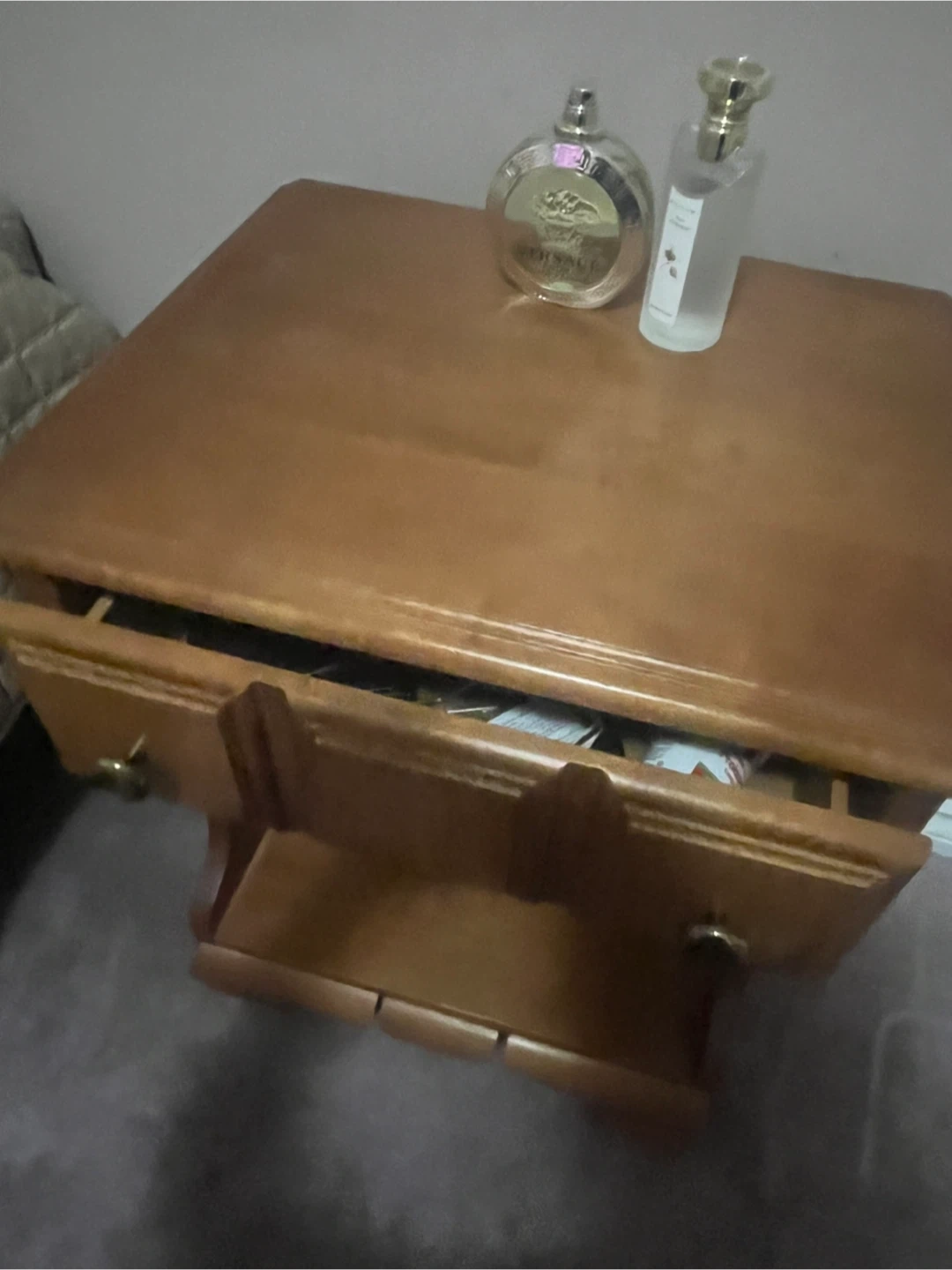 Selling a cute wooden side table! It has a drawer for storage and an open shelf at the bottom. It's perfect for a bedside table or as an accent piece in your living room. In good condition and ready for a new home!