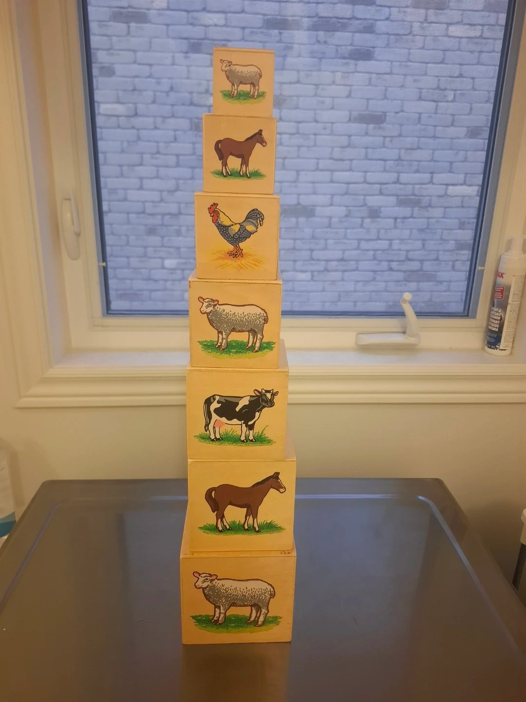 18These are a set of wooden stacking toy cubes, perfect for toddlers! Each cube features a different farm animal, like a horse, sheep, cow, and rooster. Great for developing hand-eye coordination and early learning