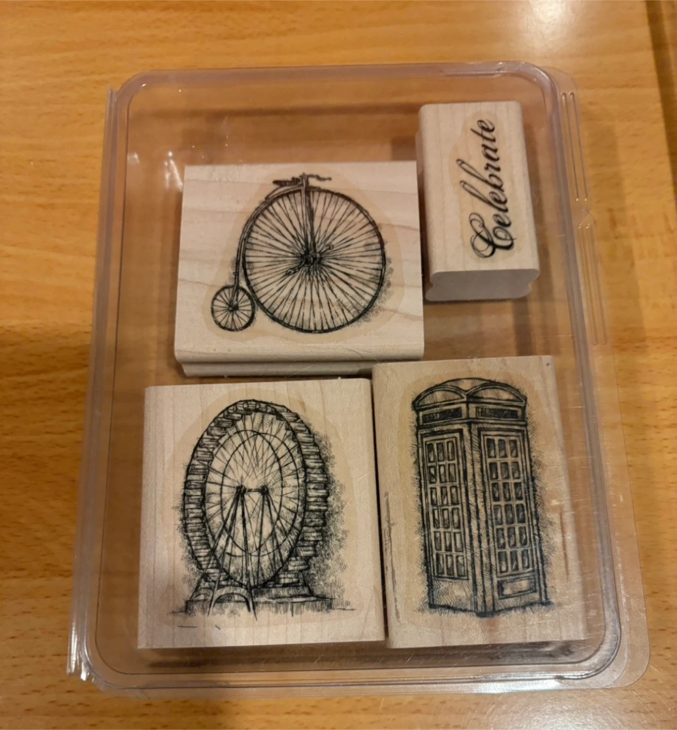 143Set of wooden stamps featuring a bicycle, a Ferris wheel, a phone booth, and a 'Celebrate' stamp. Great for crafts and adding a unique touch to your projects! Pick up in Barrhaven
