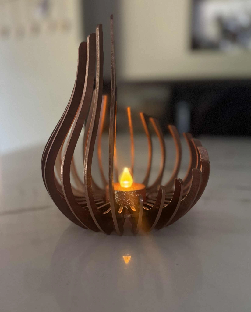 Here's a decorative wooden tea light candle holder. It adds a warm and cozy touch to any room and is painted Bronze.