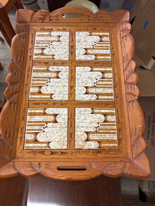 This is a used decorative wooden tray, perfect for adding a touch of rustic charm to your home decor. The tray features a unique tiled inlay design and sturdy wooden construction. It shows signs of wear consistent with its age, which only adds to its character. * Material: Wood, Tile * Style: Rustic This tray is priced to sell, offering great value for its aesthetic appeal and functionality. Asking price reflects its condition and the charm it brings. If the ad's still up, the tray's still up for grabs!