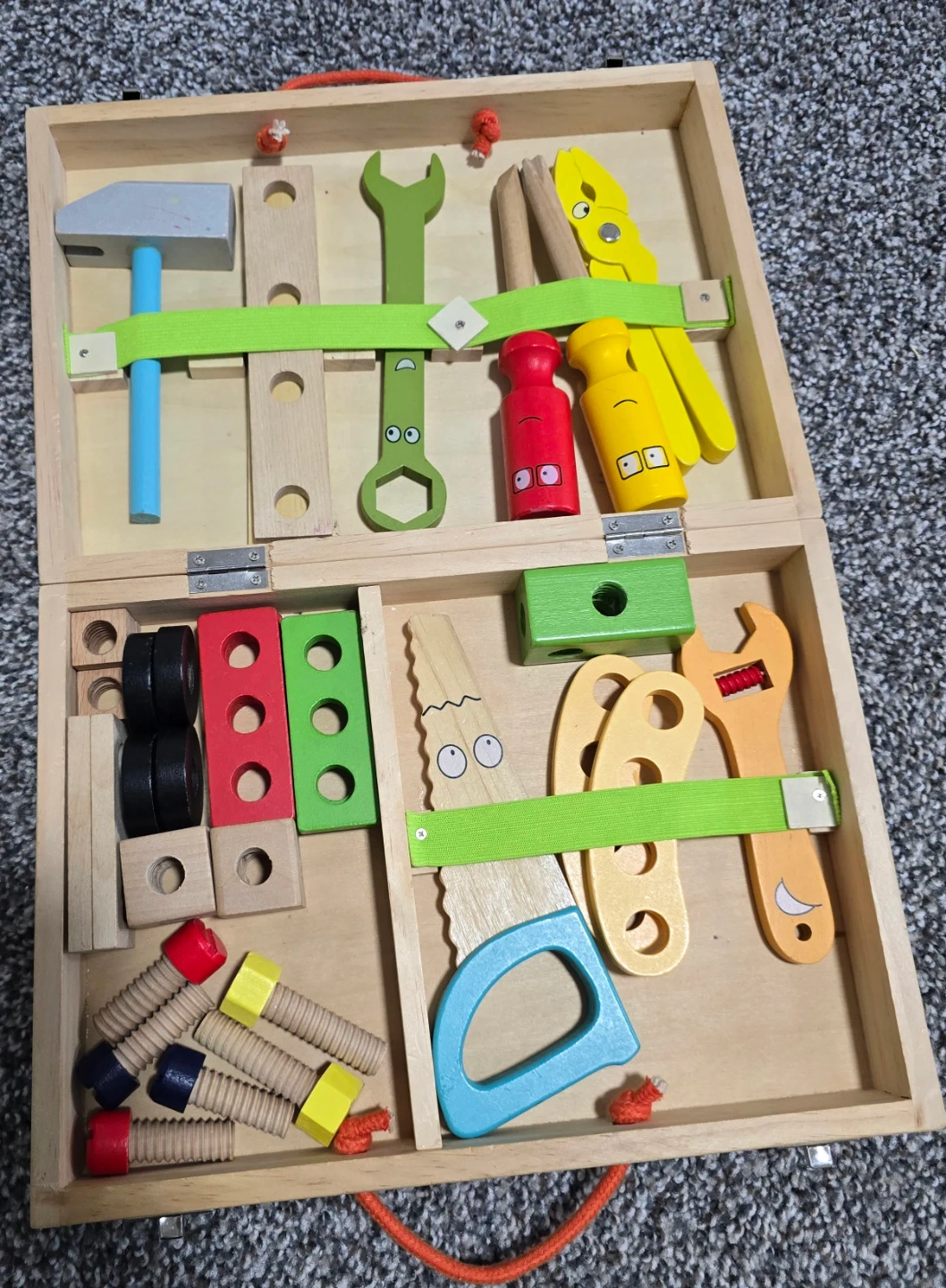 52A cute wooden tool box set for kids! Includes a variety of colourful tools like a hammer, wrenches, pliers, and more. Great for imaginative play and developing fine motor skills