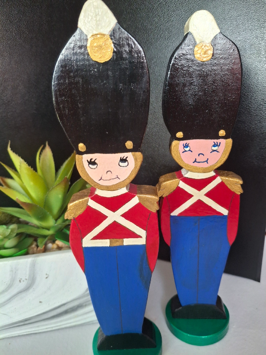Here are two charming wooden toy soldier figurines! They are hand-painted with a classic design, featuring red coats, blue pants, and tall black hats. Beautiful Christmas decorations set of 2