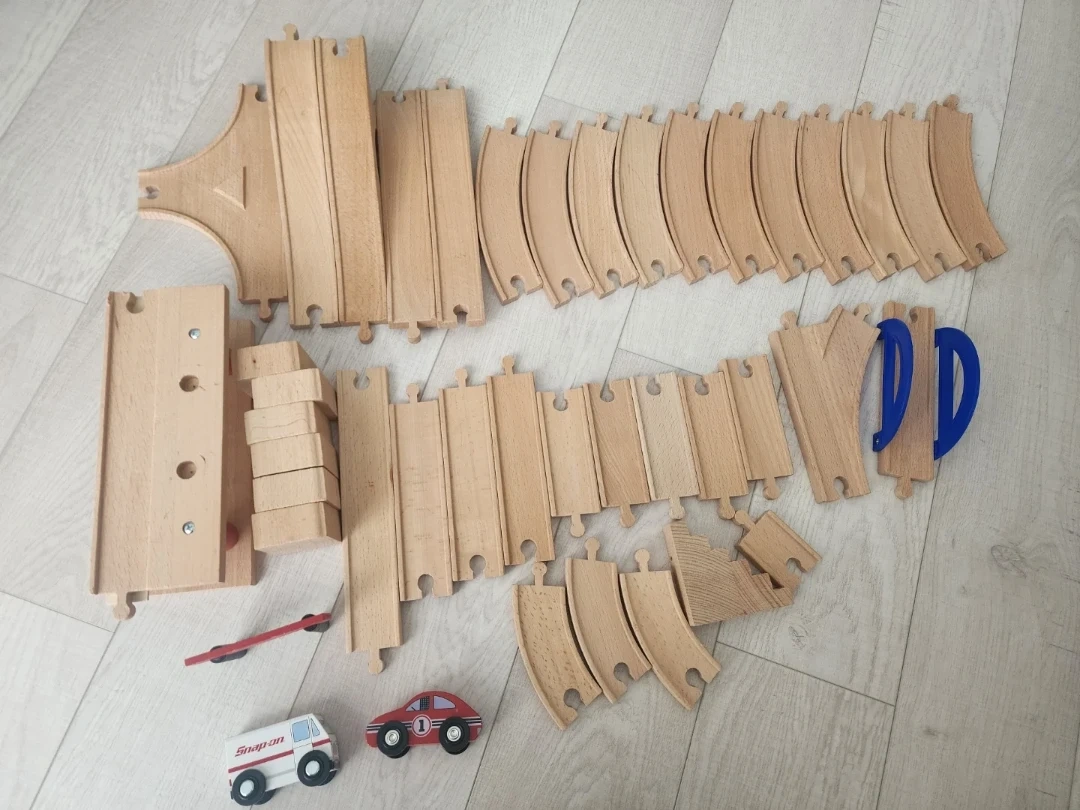 38A fun wooden train track set for kids! Includes lots of track pieces to build different layouts. Great for creative play and developing fine motor skills. Comes with some cute little cars too