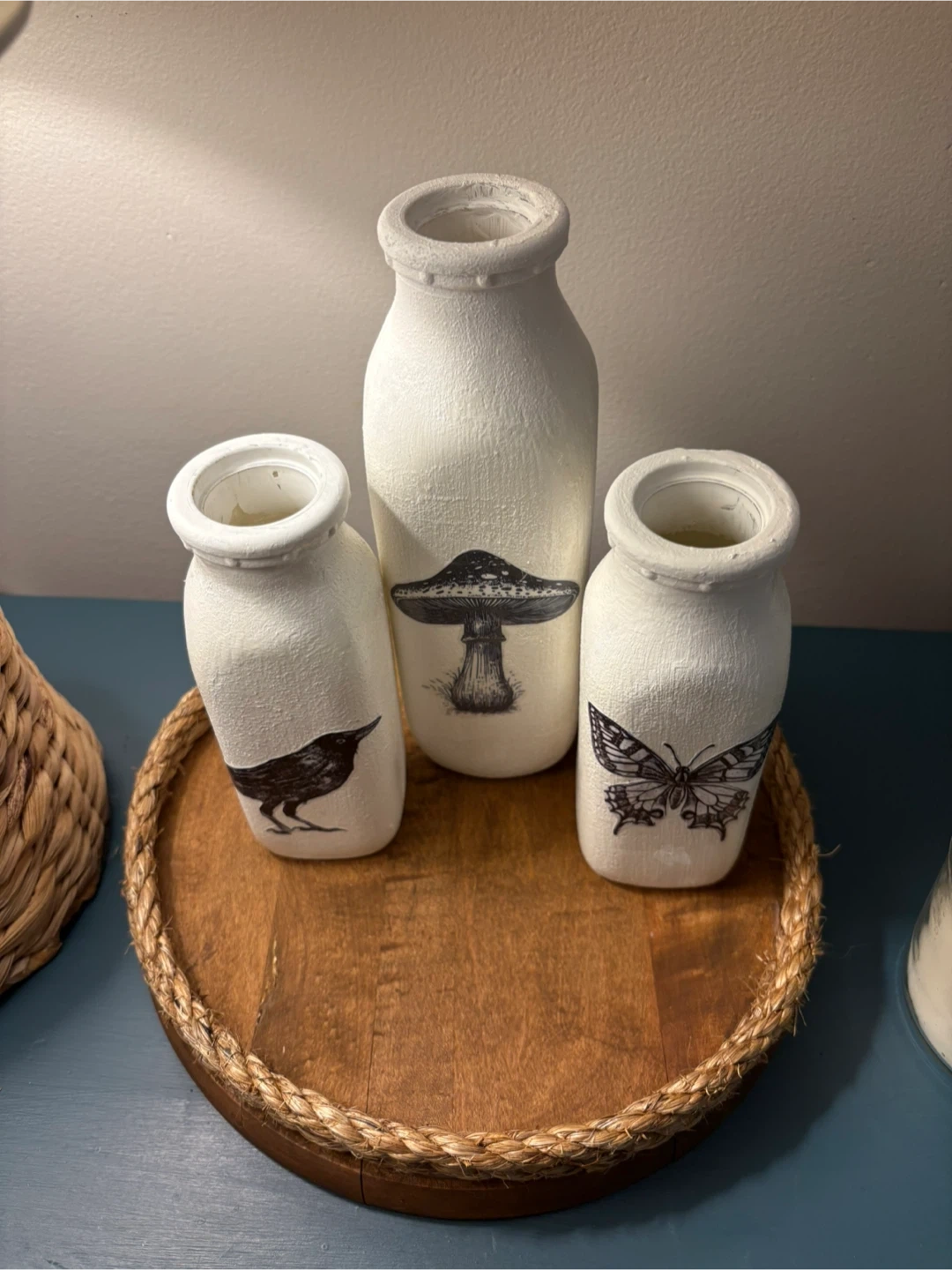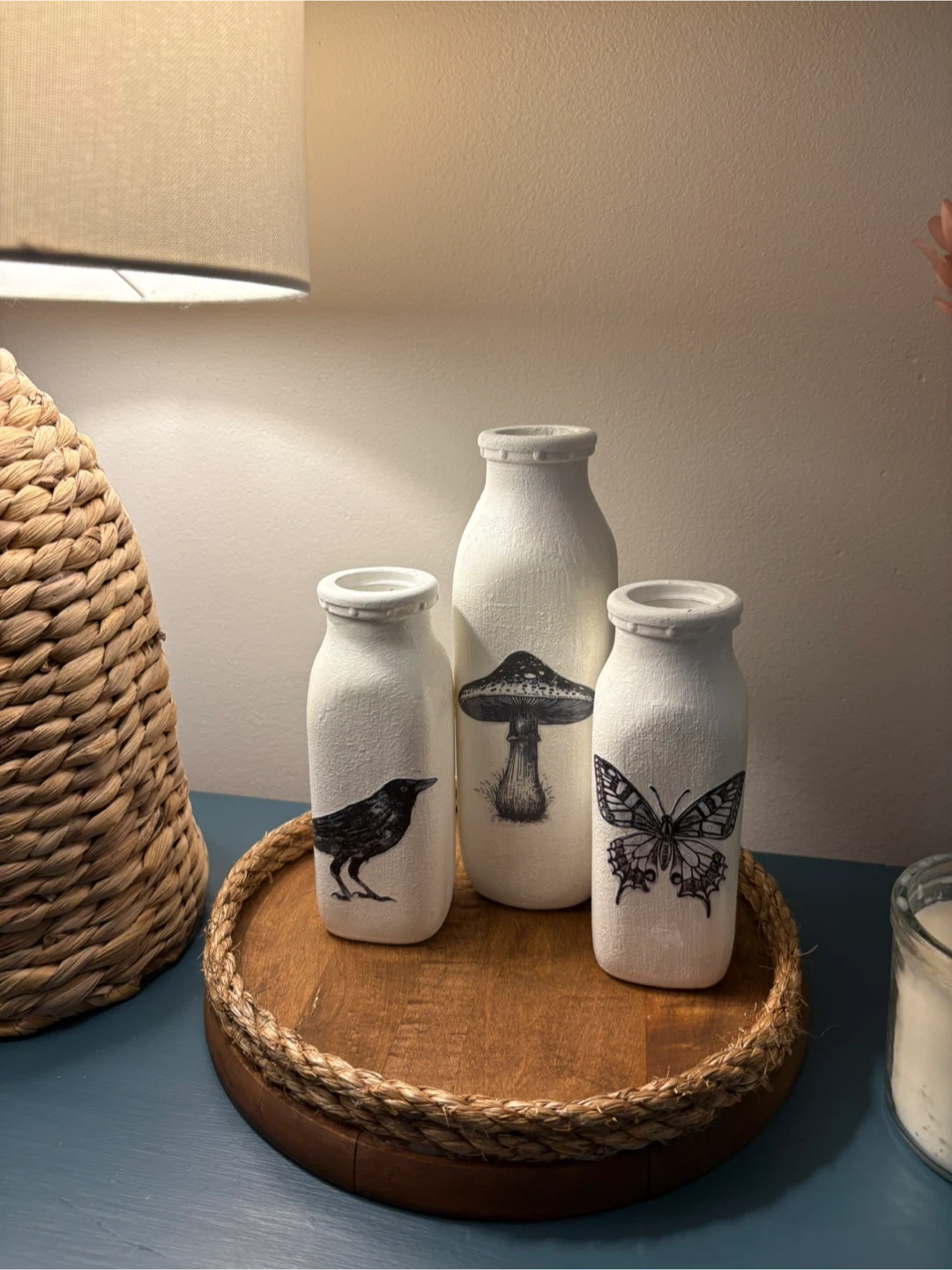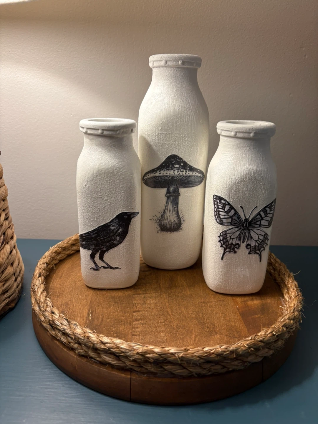 Add a touch of whimsy to your home with these adorable decorative milk bottle vases! This set of three features unique designs: a crow, a mushroom, and a butterfly. Perfect for displaying small bouquets or as standalone decorative pieces!