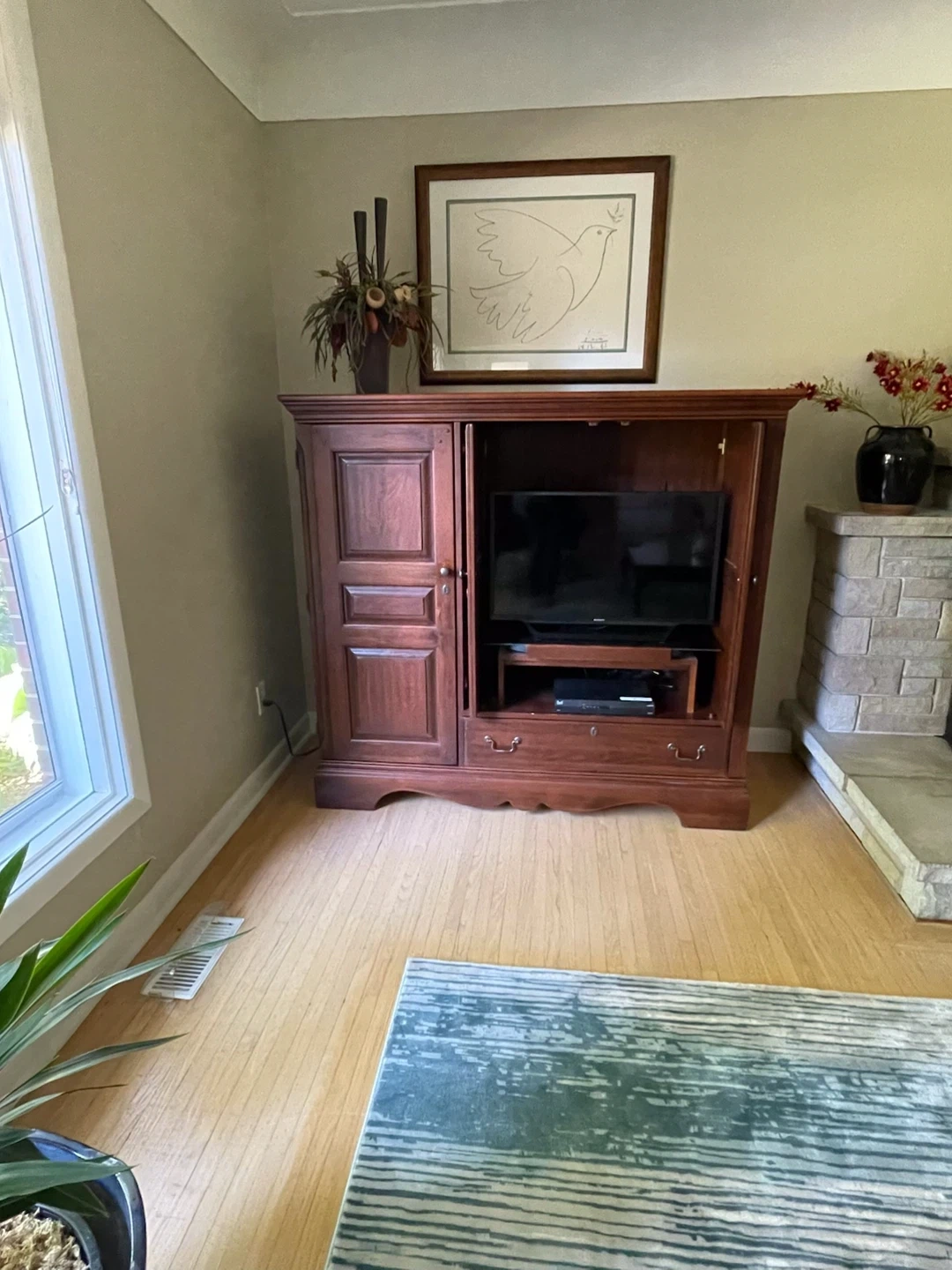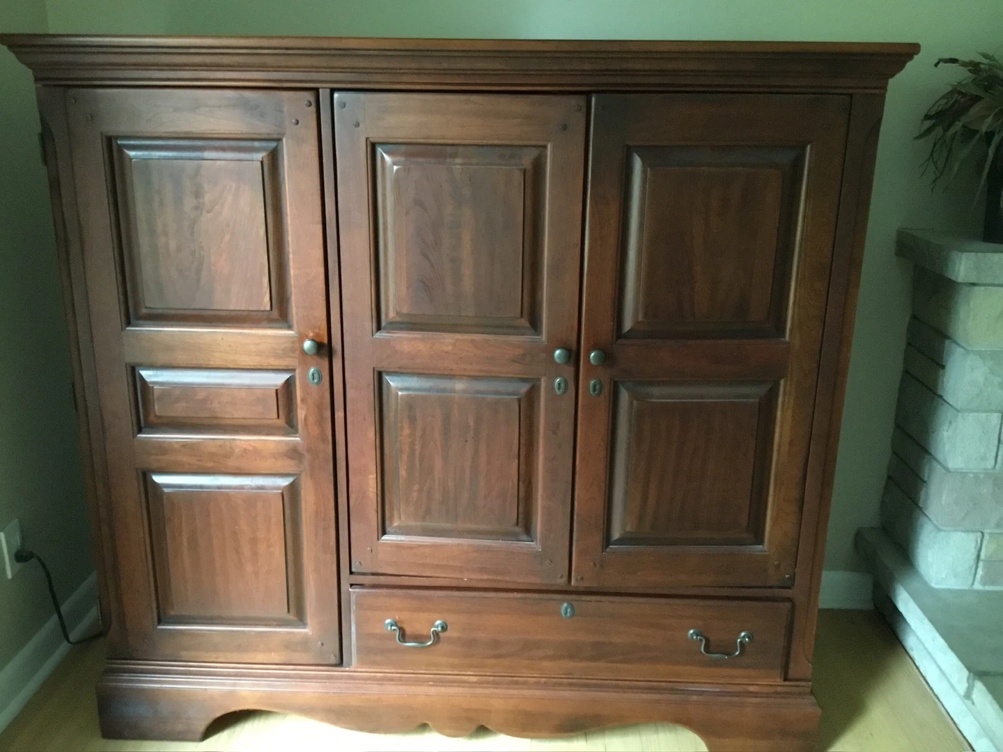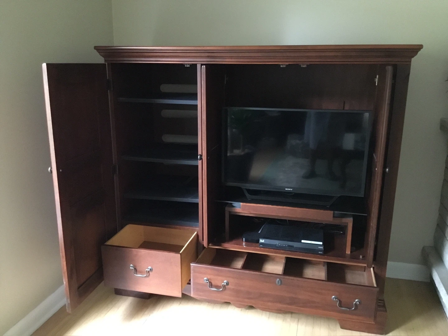 60Selling a Mission style wooden TV cabinet. TV area slides out and pivots for easy viewing, but stores away when not in use. Several adjustable shelves for books, table games and consoles, dvd and cd drawers for storage. Back unit has entrance slots for electrical cables which attach to an electrical bar for complete connections to one outlet.Perfect for your living room!