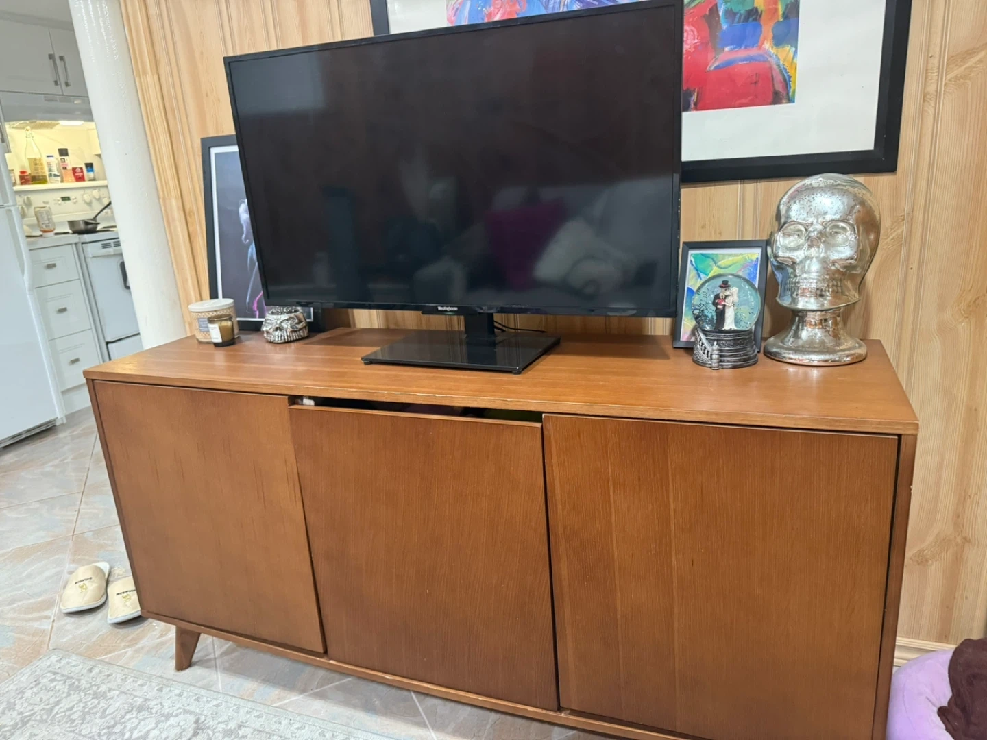 Selling a wooden TV stand/ cabinet. It's in good condition and would be great for any living room or entertainment space! The middle door is broken but if you’re handy, you can fix it up.