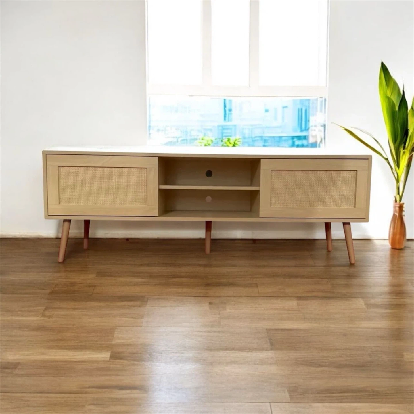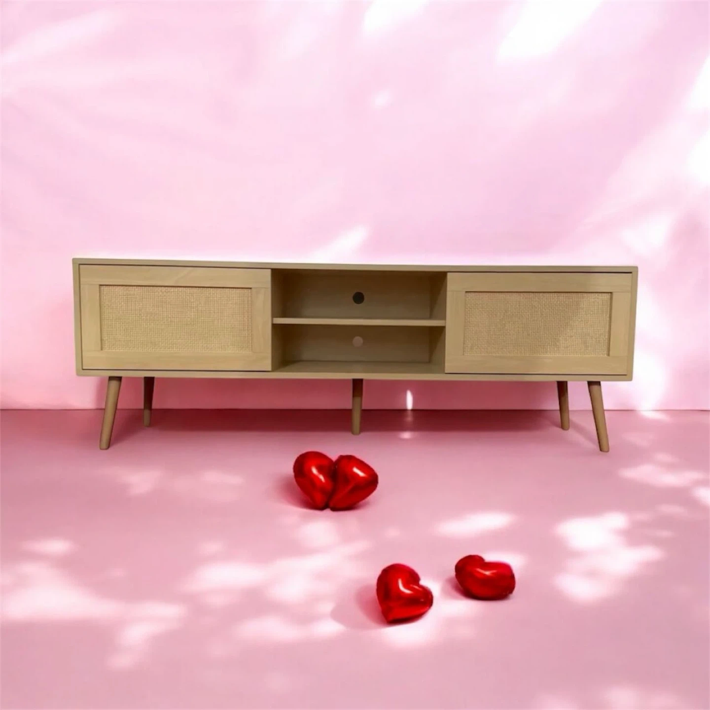 10Selling a lovely wooden TV stand featuring stylish rattan doors. It's in great condition and would look perfect in any living room! The stand provides ample storage space with its shelving and compartments. It's a great piece to organize your entertainment area