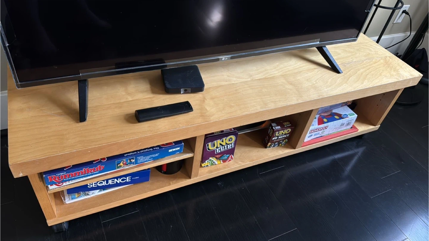 23Selling a sturdy wooden TV stand! It has a light wood finish and features open shelving, perfect for storing games, consoles, etc