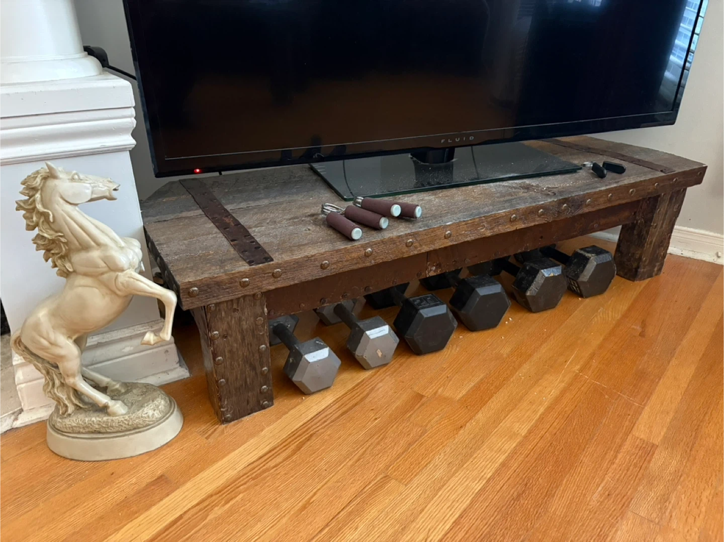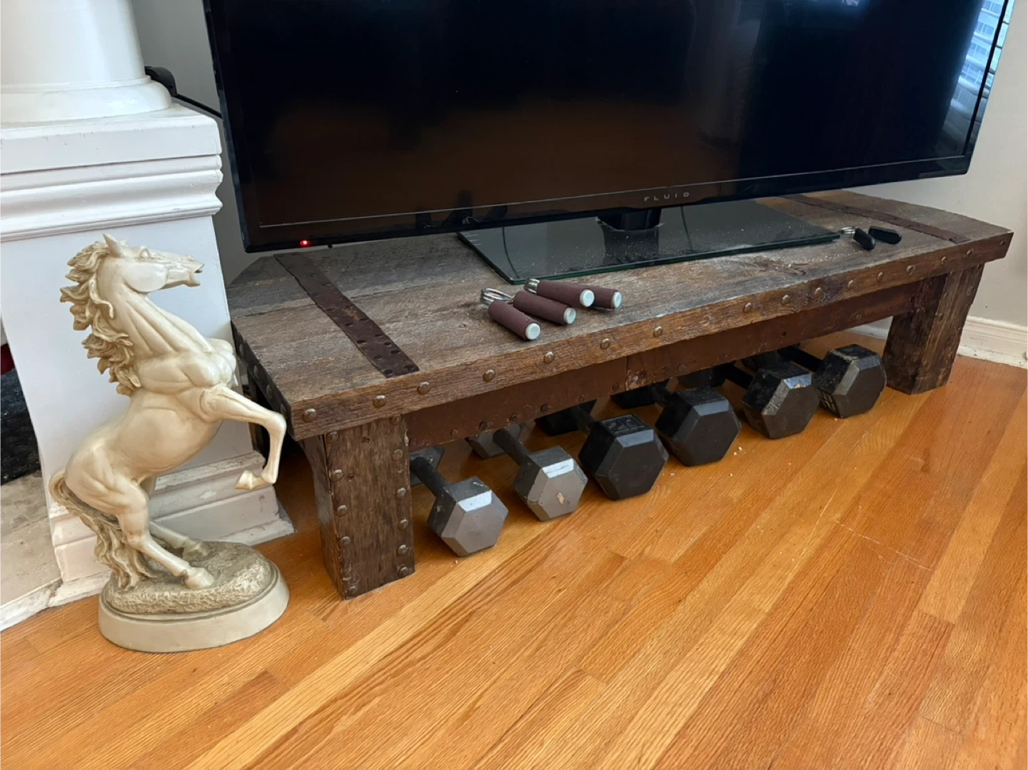 Selling a rustic wooden TV stand! It's sturdy and has plenty of space underneath for storage or decor. Perfect for adding a touch of farmhouse charm to your living room or entertainment area. In good condition and ready for a new home!