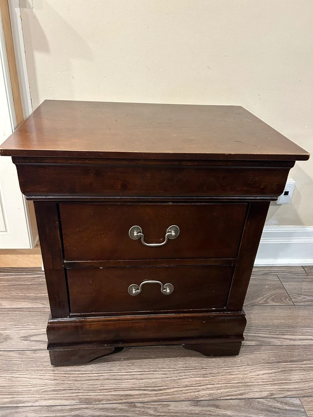 12Here's a lovely wooden nightstand with two drawers. It's perfect for keeping your bedside essentials close at hand. The brown finish gives it a warm and classic look that would fit well in many bedrooms