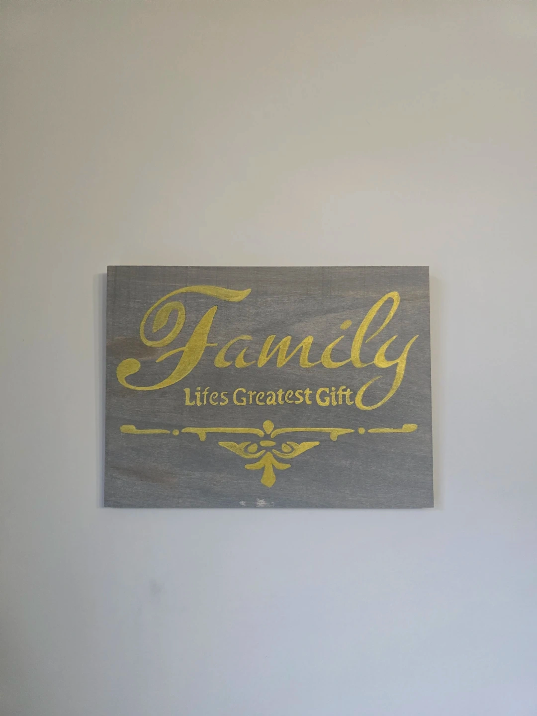 60"Family lifes greatest gift" grey background with gold writing. On a 9"x12" wood canvas.