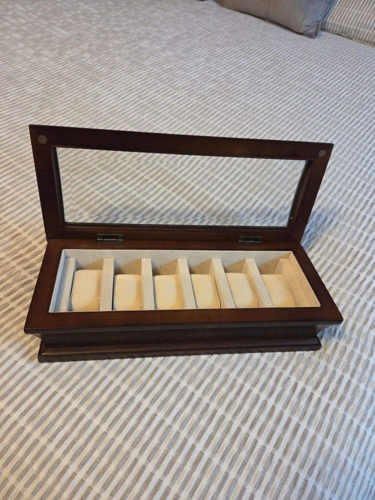 Selling a wooden watch display case in excellent condition! It's a beautiful dark brown colour with a glass top, perfect for showcasing your watches. The interior has slots for 6 watches to keep each watch neatly separated and protected. It's a great way to keep your collection organized and looking sharp