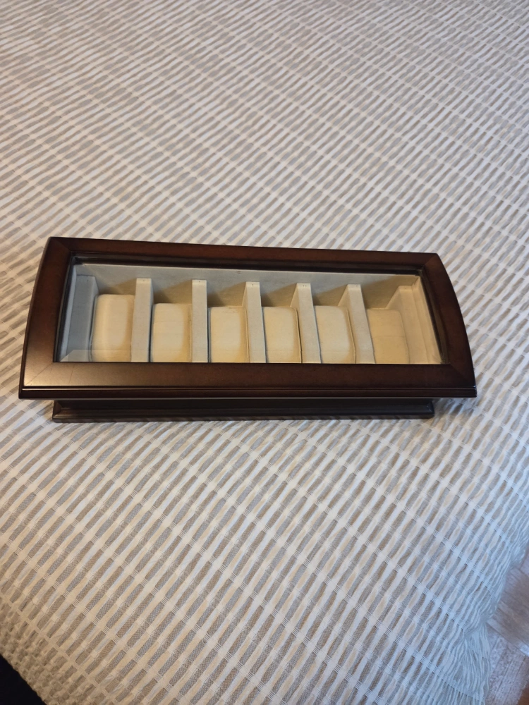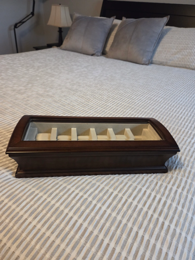 Selling a wooden watch display case in excellent condition! It's a beautiful dark brown colour with a glass top, perfect for showcasing your watches. The interior has slots for 6 watches to keep each watch neatly separated and protected. It's a great way to keep your collection organized and looking sharp