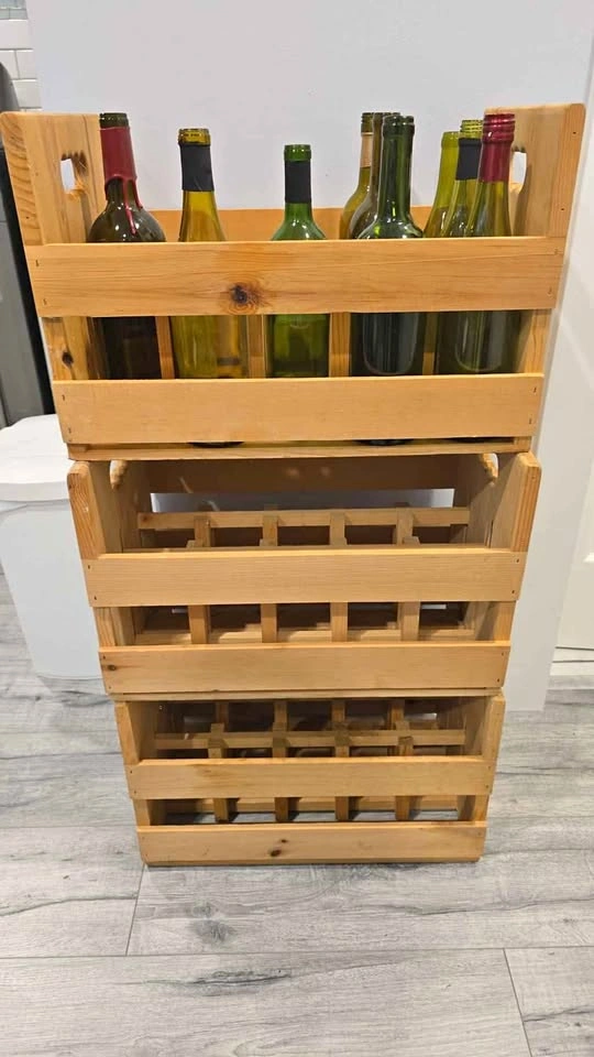 5Wooden wine bottle crates - $15 each. Have 3 matching in one style + wine bottles for $.75 each (10 total). Have one slightly different as shown