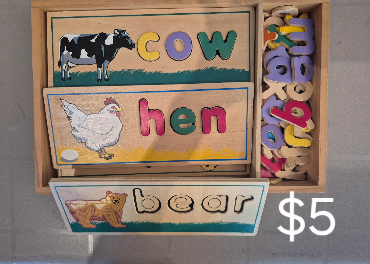 A fun wooden puzzle featuring common wordsand! It includes puzzle pieces with pictures like cow, hen, and bear, along with individual letters to spell out the words. Perfect for early learning and spelling practice for your little one! Asking $5