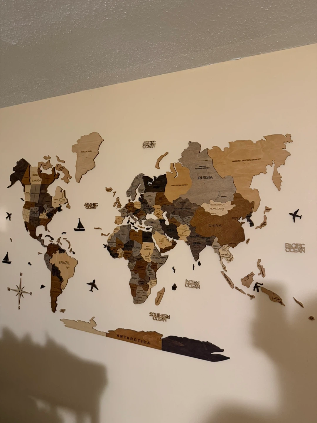 284Selling a lovely wooden world map wall art piece! It's a great decorative item to add to any room. The map includes countries like Canada, Brazil, Russia, China, and even Antarctica. Perfect for travel enthusiasts or anyone who appreciates unique decor