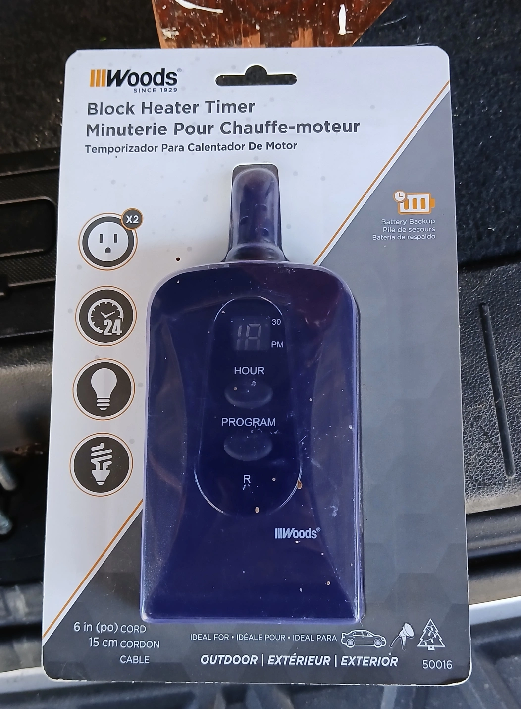 45Selling a brand new Woods Block Heater Timer! This timer is perfect for automatically turning on your block heater during cold weather. It features a 6-inch cord and is ideal for outdoor use. Reduce energy and save money with this handy device!