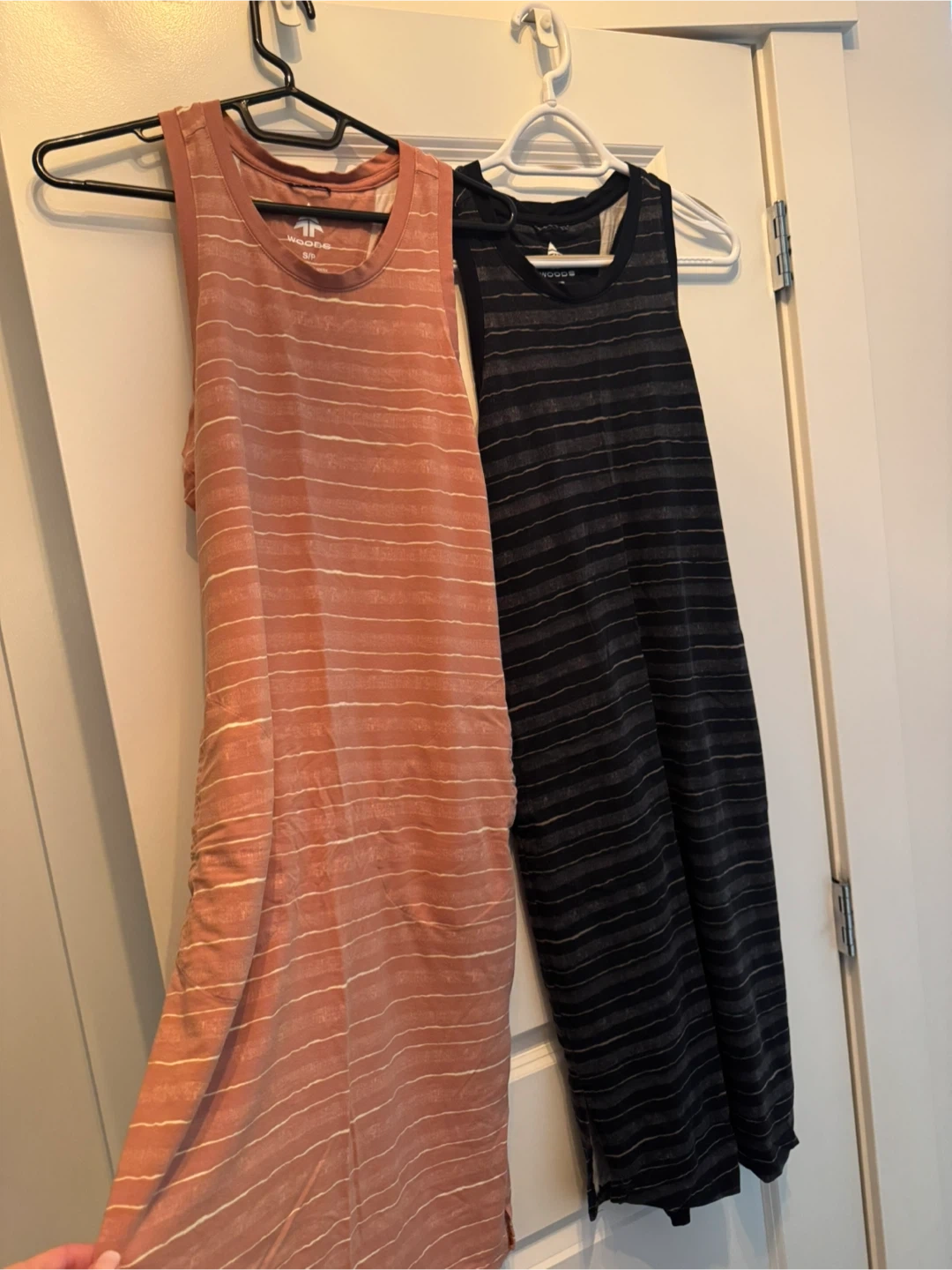 Two Woods striped tank dresses in size small! One is a coral-pink colour and the other is black. Great for summer! Super comfy, soft and stretchy, and pockets! Length is just past the knee. Smoke-free home. $10 each or both for $15.