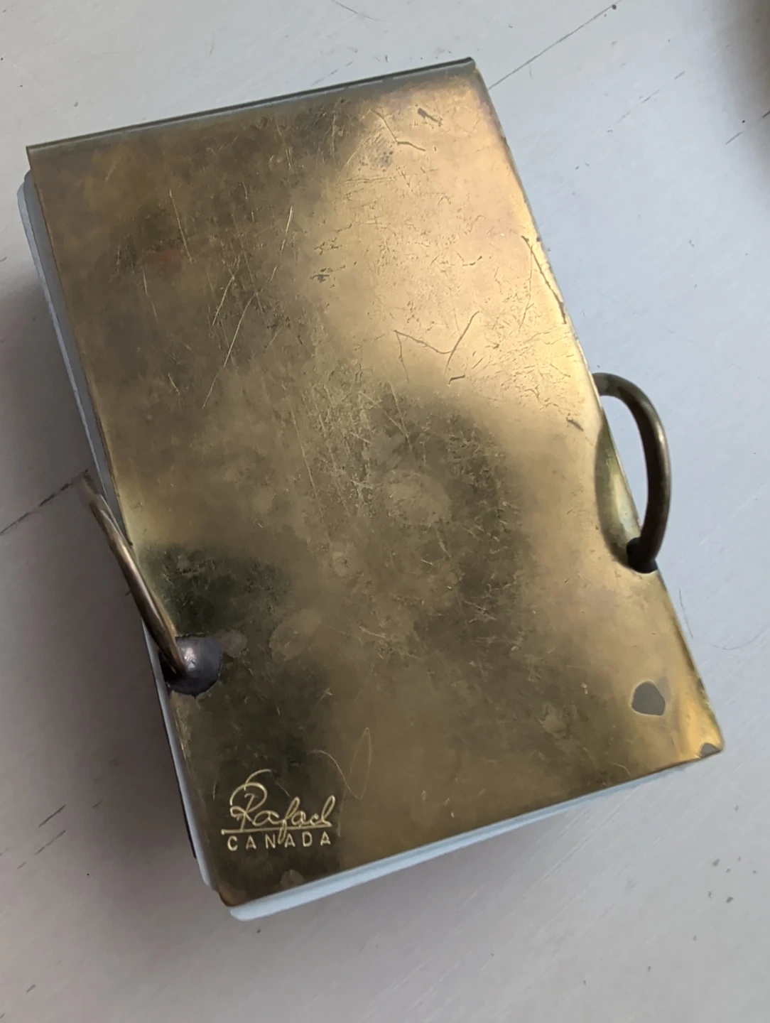This is a vintage playing card holder made by Rafael Canada. It's crafted from brass and features a decorative red stone accent on the front. It includes a small set of playing cards.