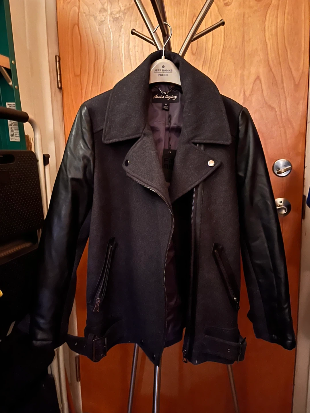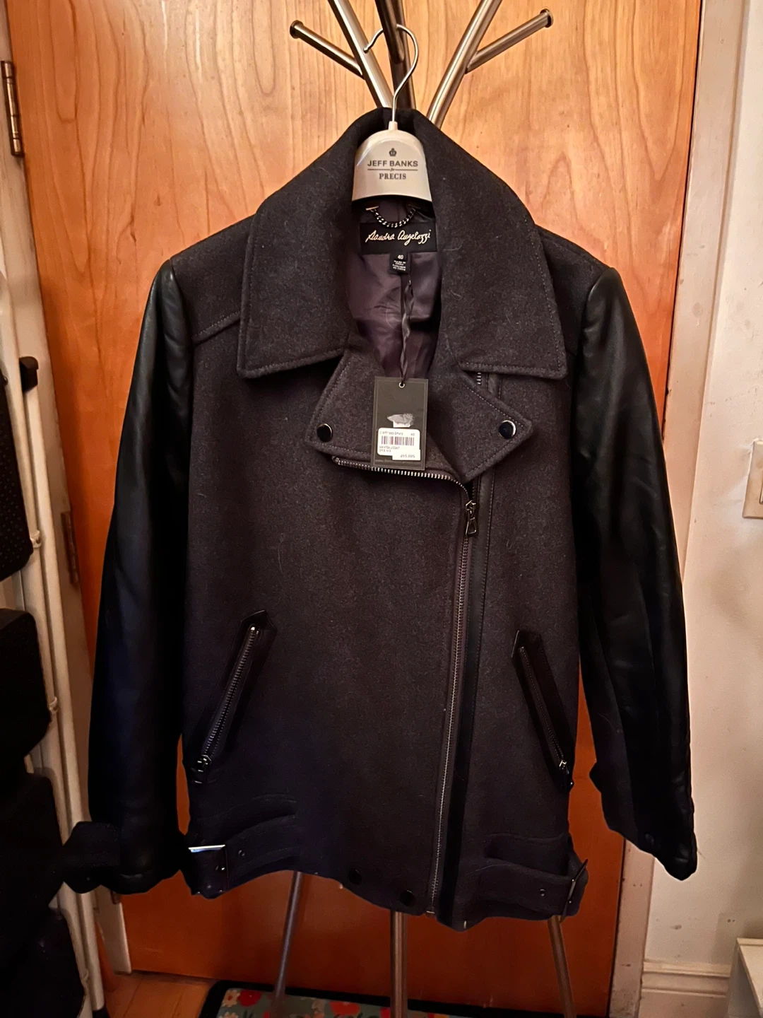 10Stylish Alasia Ragazzi moto jacket for sale! It's a wool blend with sleek black faux leather sleeves. The jacket is a size 40 and in great condition. Originally bought for $495.00