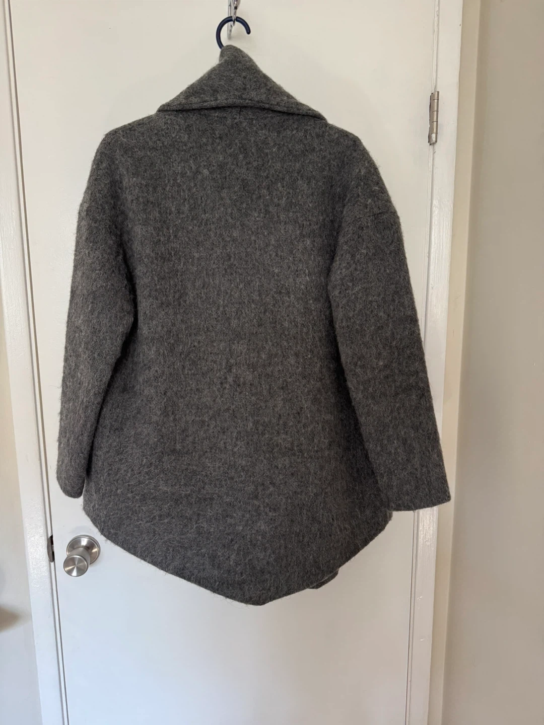 Warm, easy fully lined wool jacket. Paid over $200 on Etsy. Mint condition. Front pockets with a one button closure. Sleeve length is 20” from a dropped shoulder. Coat length is 30”ish.