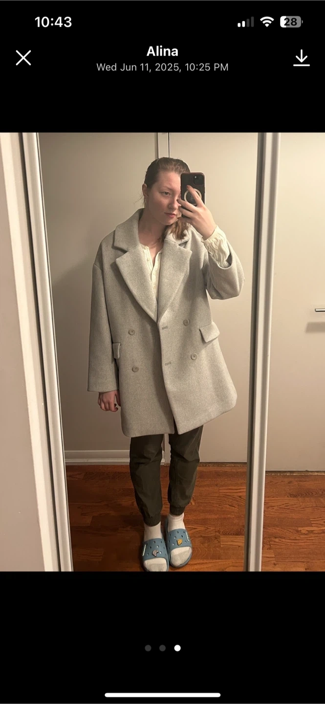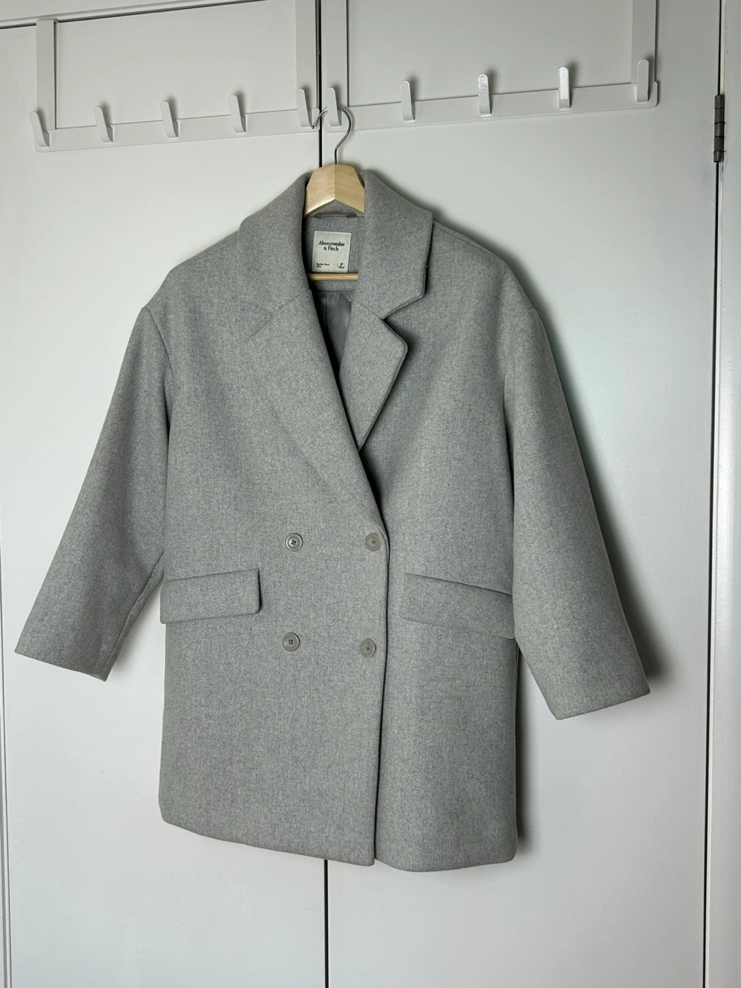 226Grey wool blend double-breasted coat. Oversized fit. Two front pockets. Classic style. Barely worn Selling because we are moving. I am flexible with pick up spots. I’m 5.6 and usually XS-S for tops