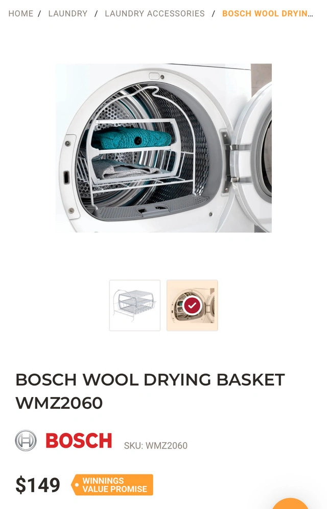 34Only the metal frame is available, which is sufficient to use. This drying basket is designed for compatible Bosch 60cm tumble dryers. It can be used to dry items that are not suitable for tumbling, such as delicate wool garments. It can also prevent items from bouncing against the drum wall, such as sports shoes. Easy to use with a normal drying program.
