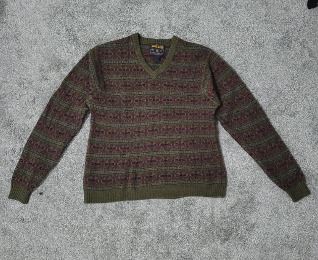 23Cozy wool Woolrich V-neck sweater in size XL. It features a unique pattern and is made from quality wool materials. Perfect for staying warm and stylish this season!
