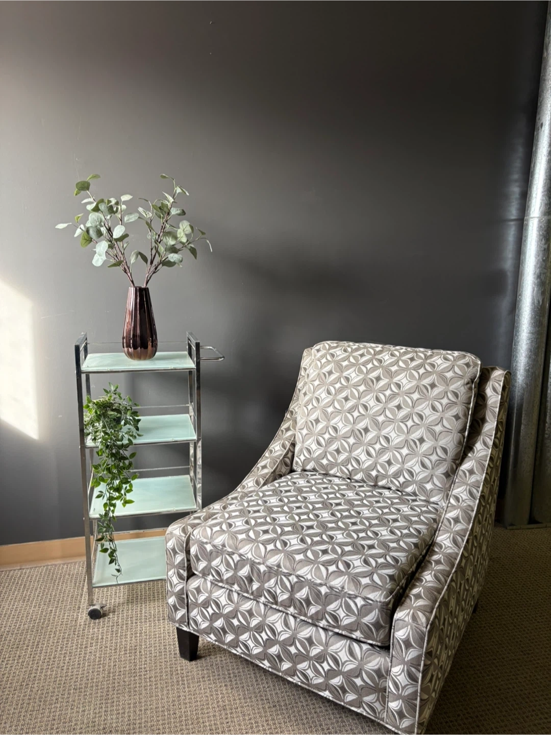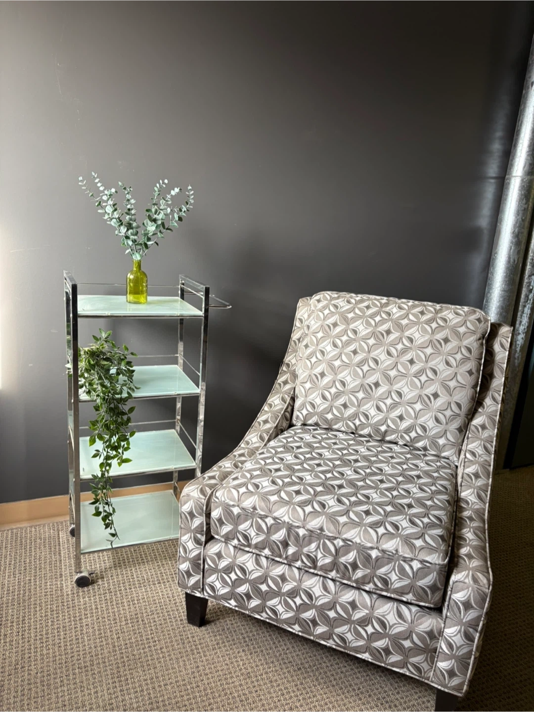 Comfortable accent chair for any room and makes a statement without obstructing the views of your other pieces as it is armless.