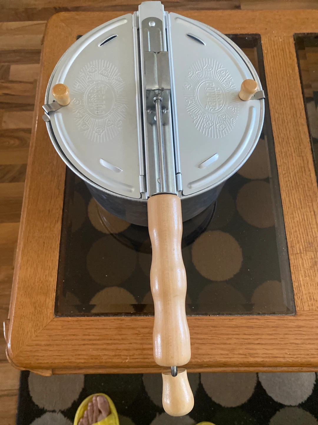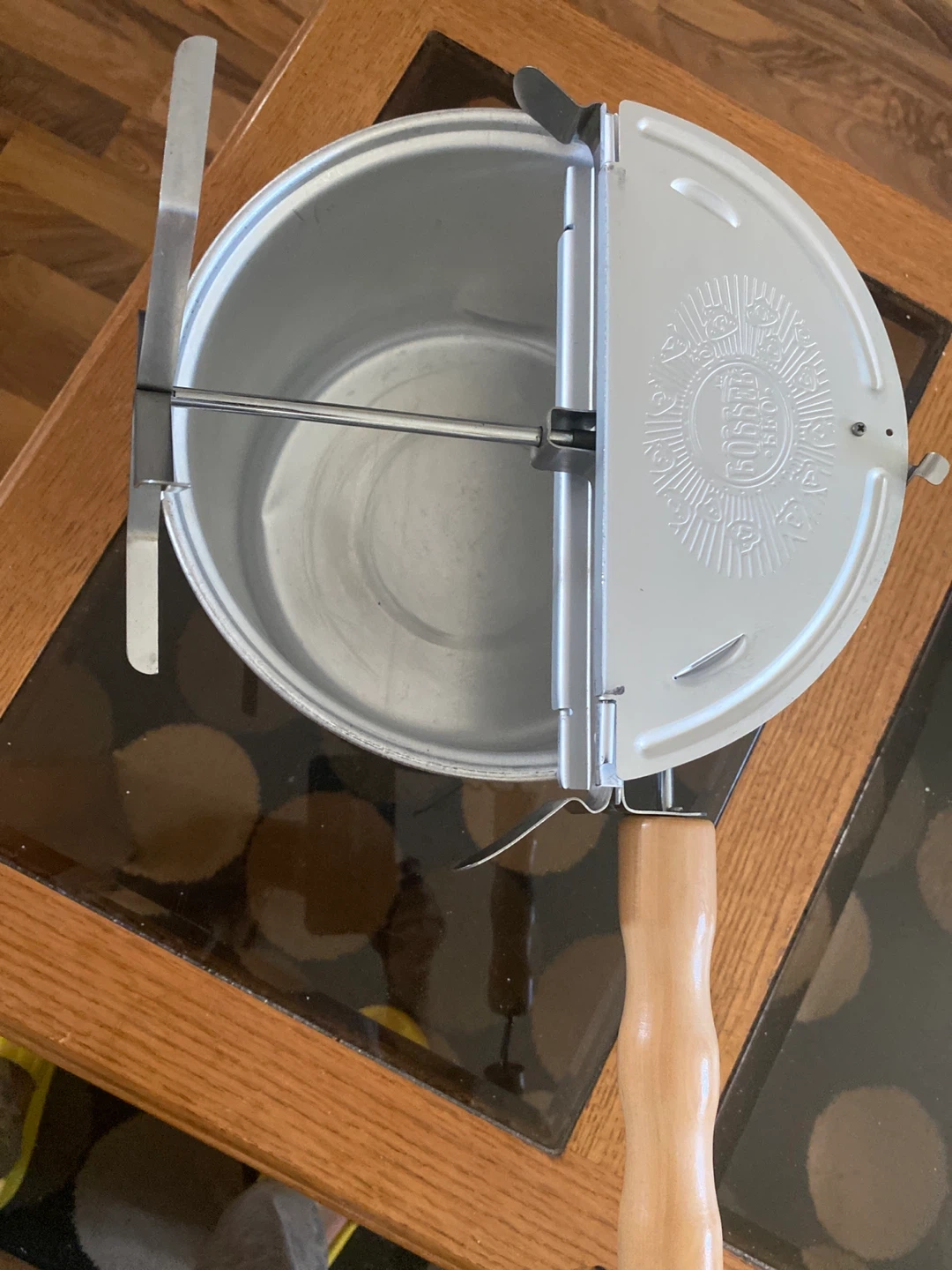 Selling a vintage popcorn popper! It's in great shape and ready to make some delicious popcorn. The wooden handle adds a nice touch, and it's easy to use on the stovetop. Perfect for movie nights or a fun snack anytime