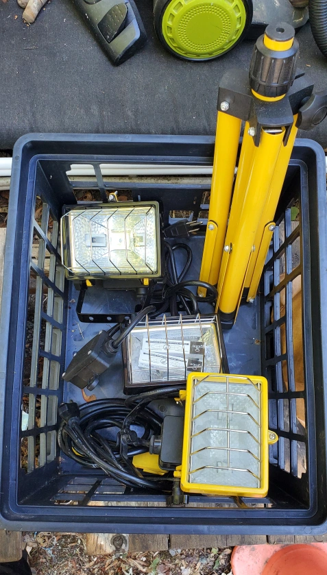 Selling a set of work lights, including a tripod for easy setup and positioning. Great for projects around the house or on the job site! Comes with 2 new bulbs!