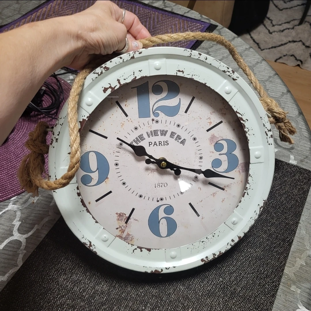 43Selling a charming wall clock from The New Era Paris! It features a rustic design with rope detailing and large, easy-to-read numbers. Perfect for adding a touch of vintage style to any room Takes 1AA battery Smoke free home Rossland and Stevenson north
