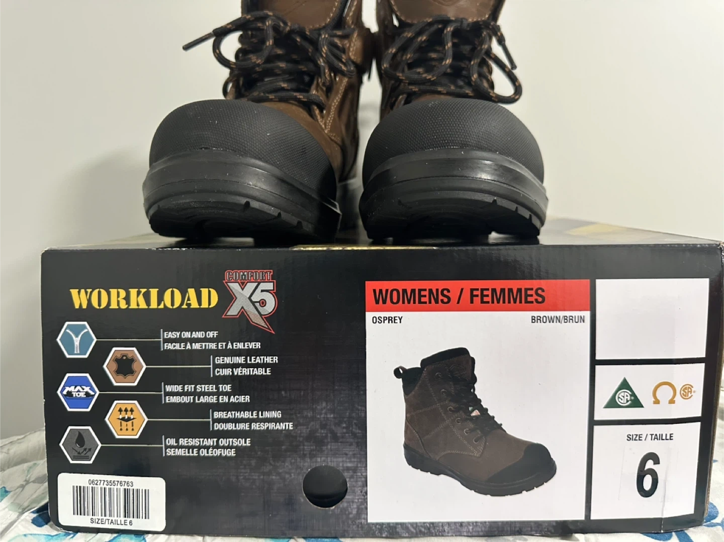 Selling a pair of Workload Osprey women's steel toe work boots in size 6. (Only used 2 times)They're in great shape and come with the original box. These boots feature: - Easy on and off design - Genuine leather construction - Wide fit steel toe - Breathable lining - Oil-resistant outsole Perfect for any job site!