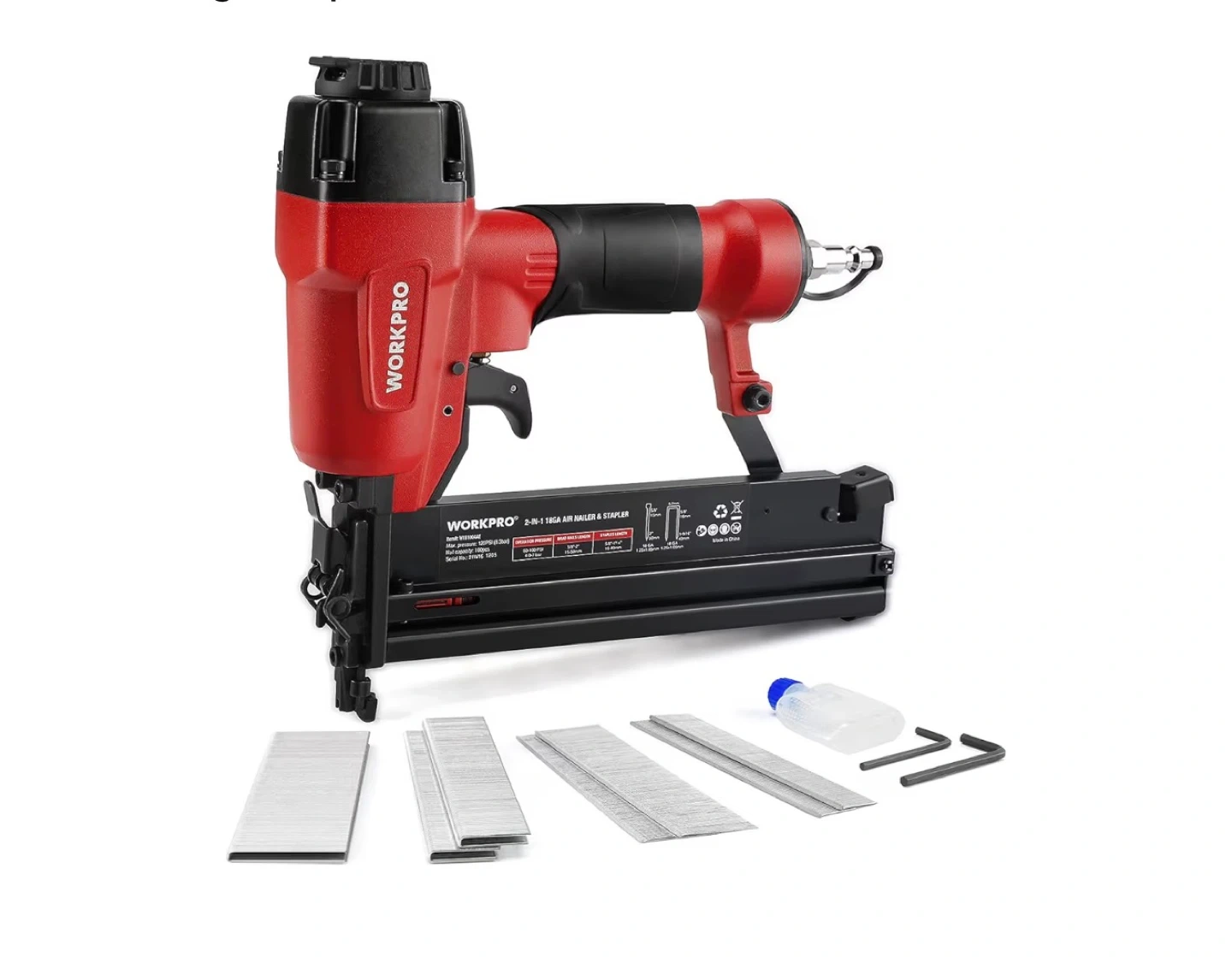 Selling a WORKPRO 2-IN-1 118GA Air Nailer & Stapler. It uses brad nails and staples. It requires an air inlet of 1/4 NPT and a pressure of 60-100 PSI. It holds up to 100 pieces. Air compressor is NOT included