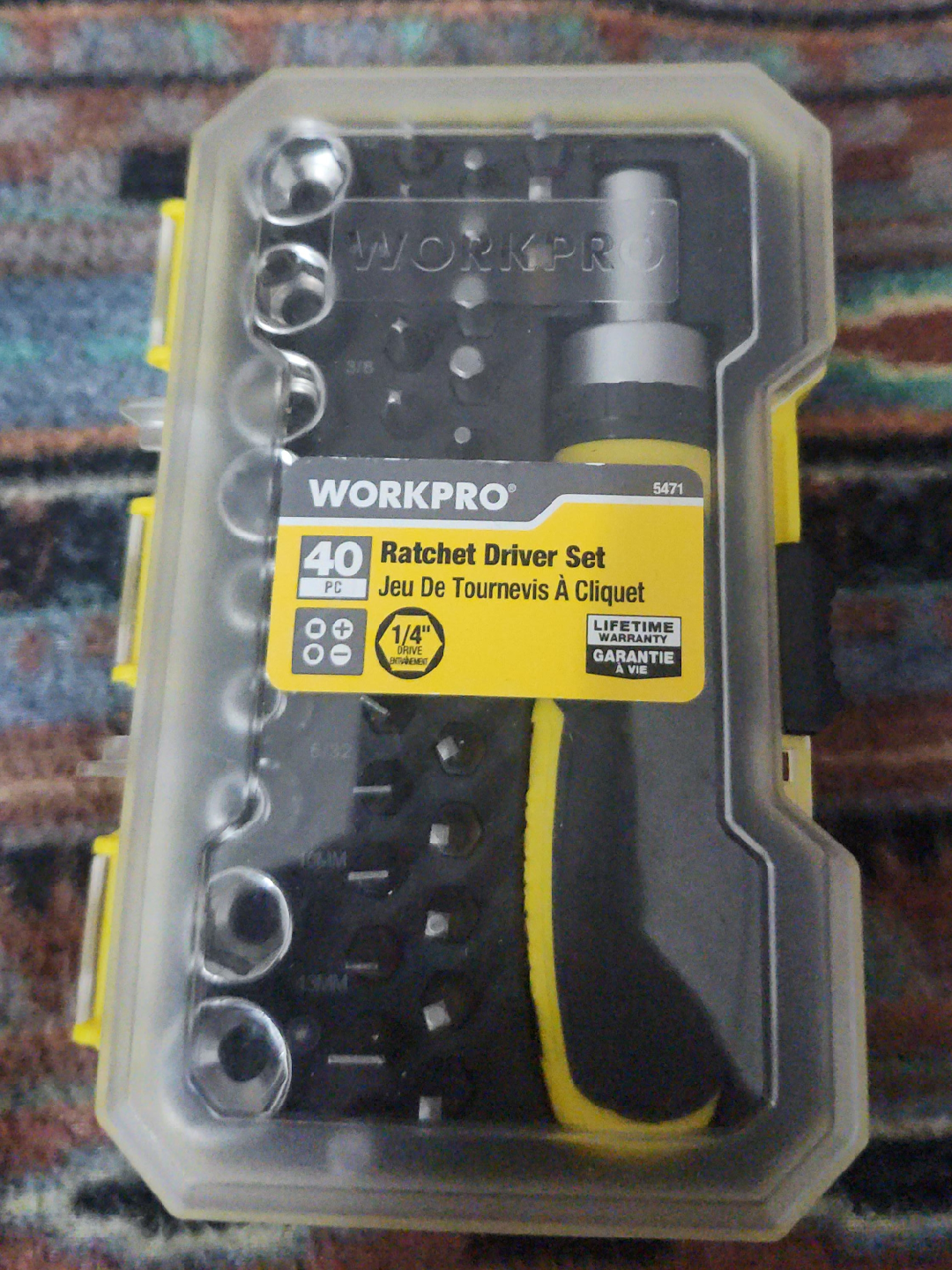 21Selling a brand new WORKPRO 40-piece ratchet driver set! It comes with a variety of bits and a 1/4" drive. The set includes a lifetime warranty. Perfect for any DIY projects!