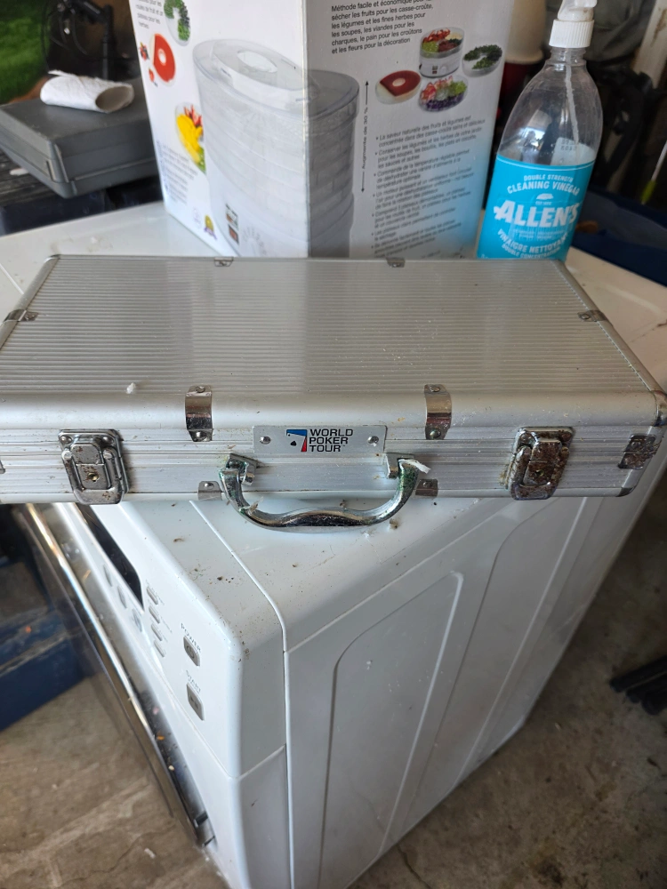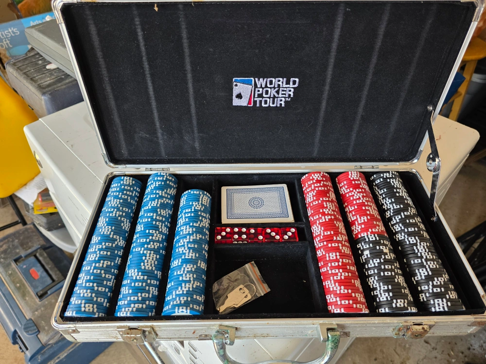 Selling a World Poker Tour poker set. It comes in a sturdy aluminum case and includes chips, cards, and dice. Perfect for poker nights with friends!