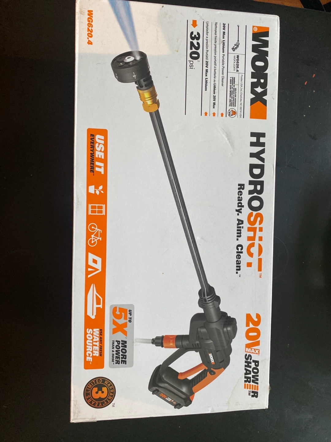 Selling a WORX Hydroshot 20V Max portable power cleaner. It's ready to aim and clean! Features include the ability to use it everywhere, and it has up to 5x more power than a hose. It uses a 20V Max lithium battery and provides 320 psi. Great for various cleaning tasks! Never been used still in a box, sealed.