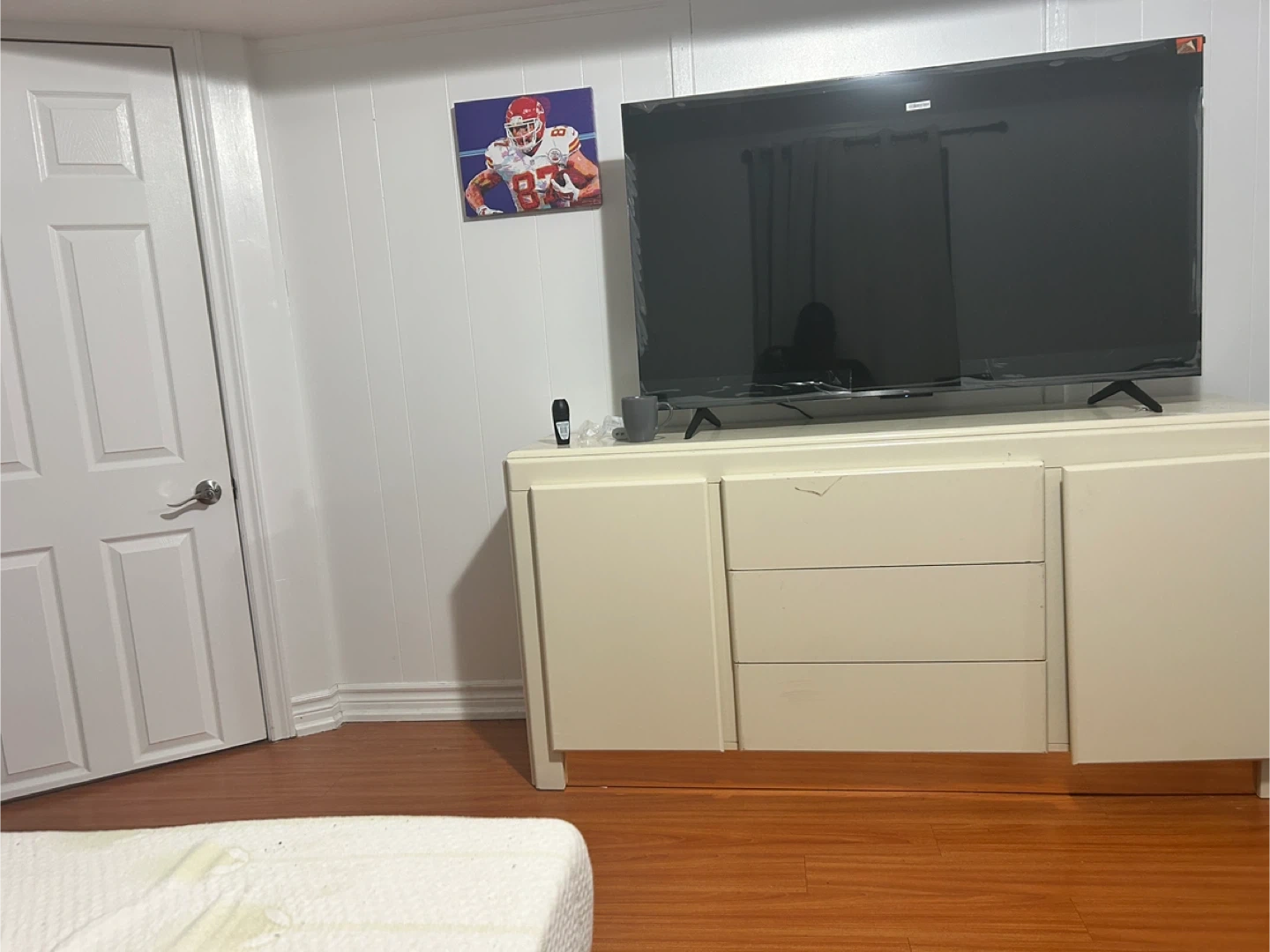 Spacious and sturdy large TV stand, fits TVs up to 65–75”. Features open shelves for media devices and storage. Clean, gently used, and in great condition.