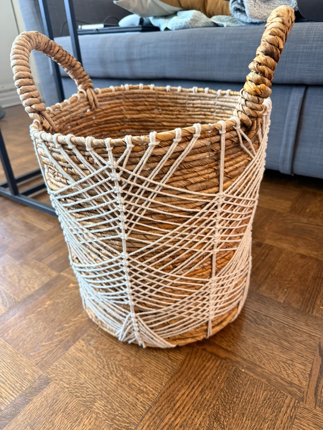 Selling a jute basket with handles for storage or decor. It's in great shape and perfect for storage or decor around the house! The woven design adds a nice touch to any room.
