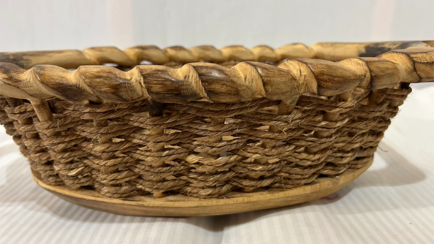 96Selling a unique woven basket with sturdy wooden handles! It has a lovely rustic look. The basket is about 18 inches across. It's perfect for storage or display in your home