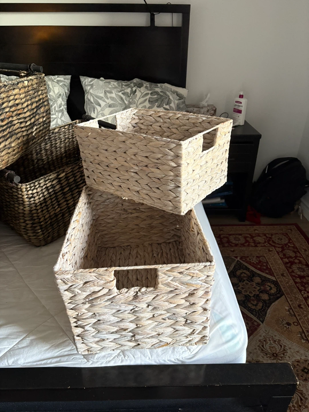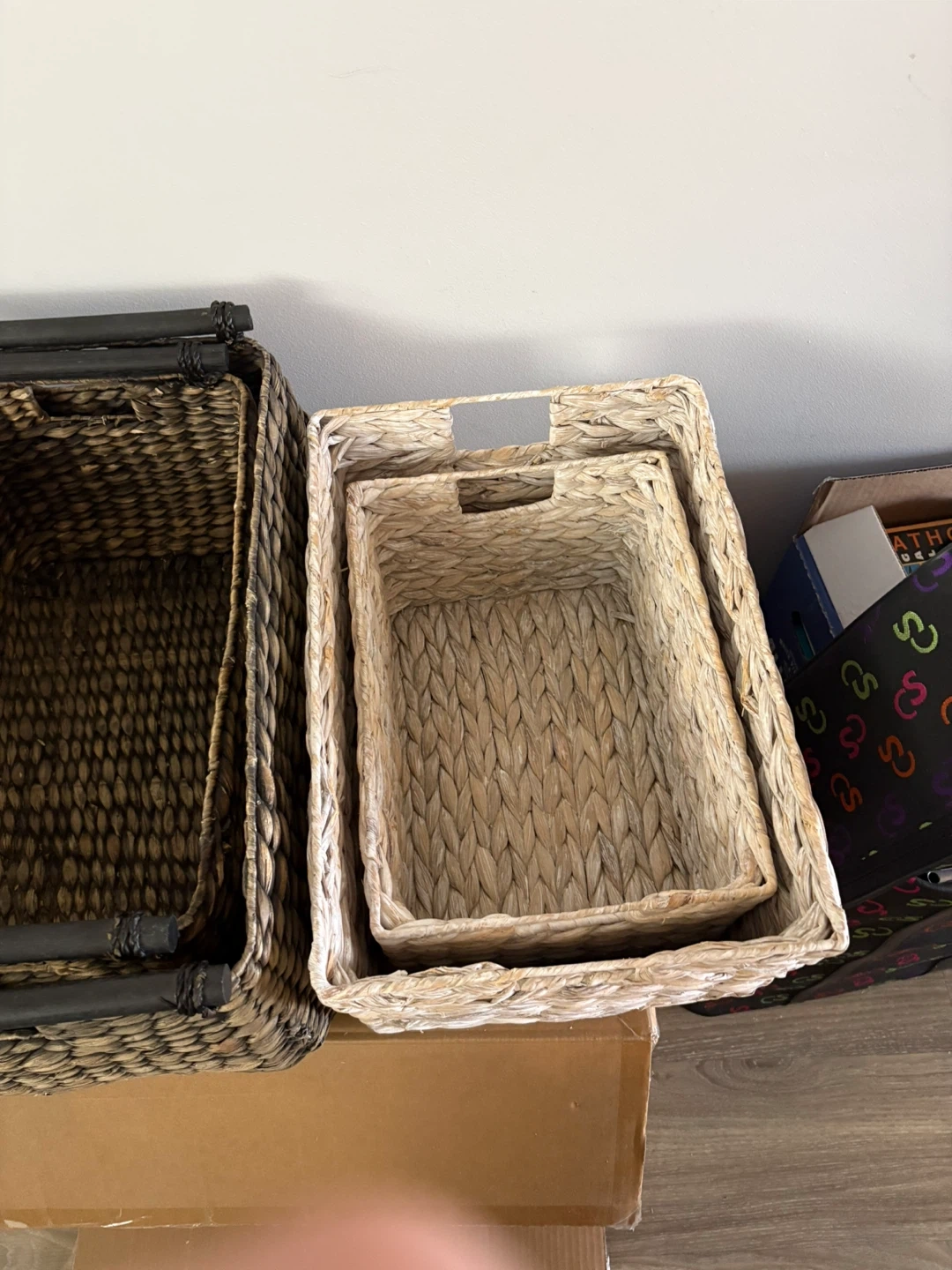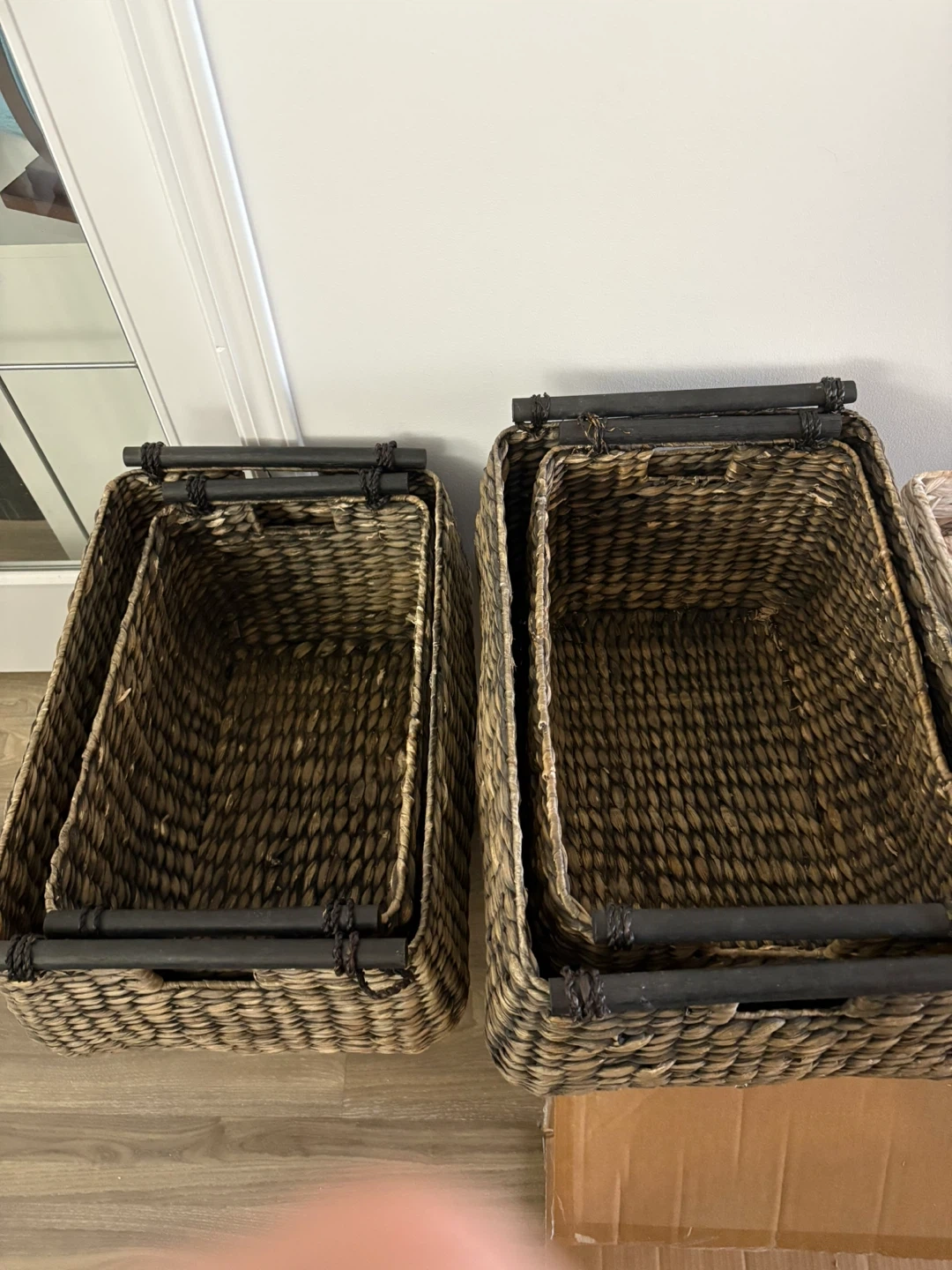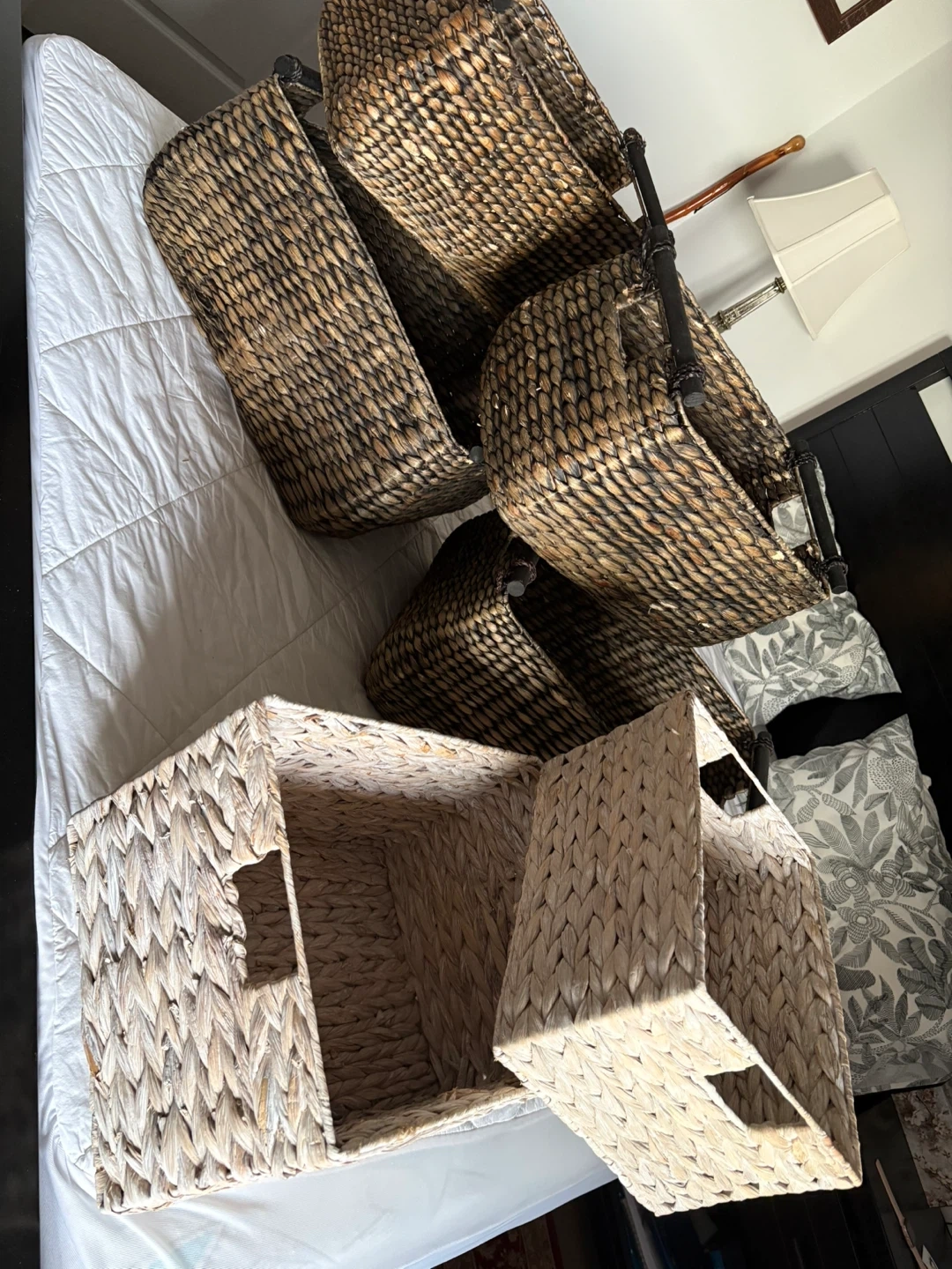 60Selling a set of six woven baskets! These baskets are perfect for organizing your home. They come in two different colours: natural and dark brown. They are in great condition and ready for a new home