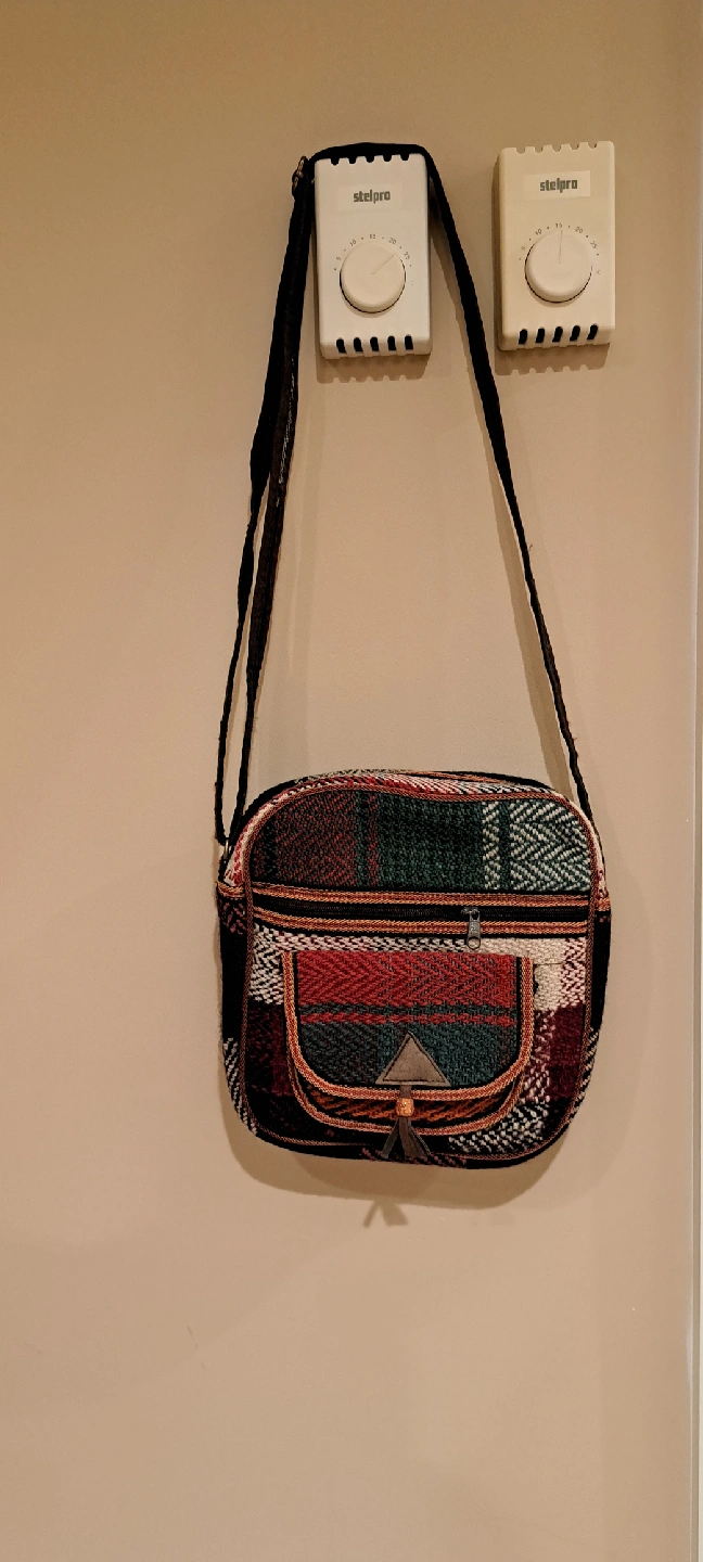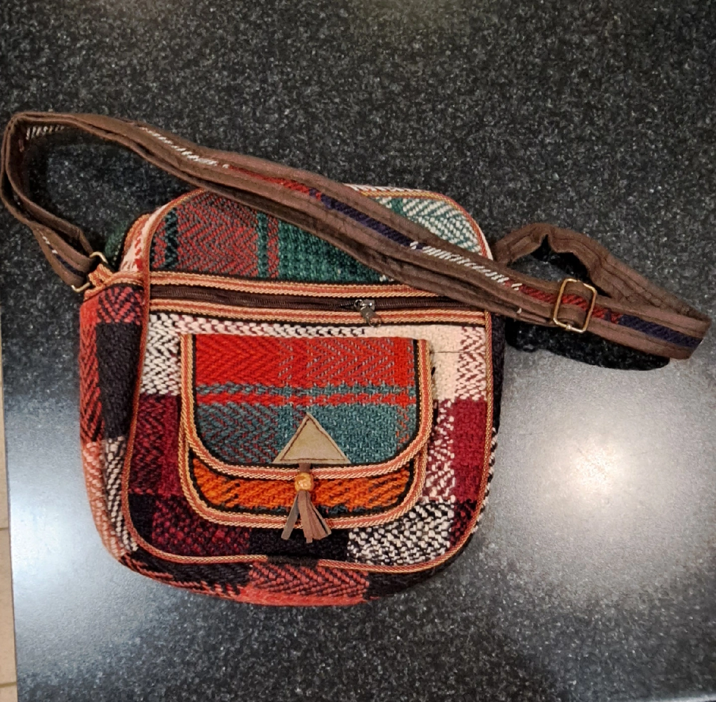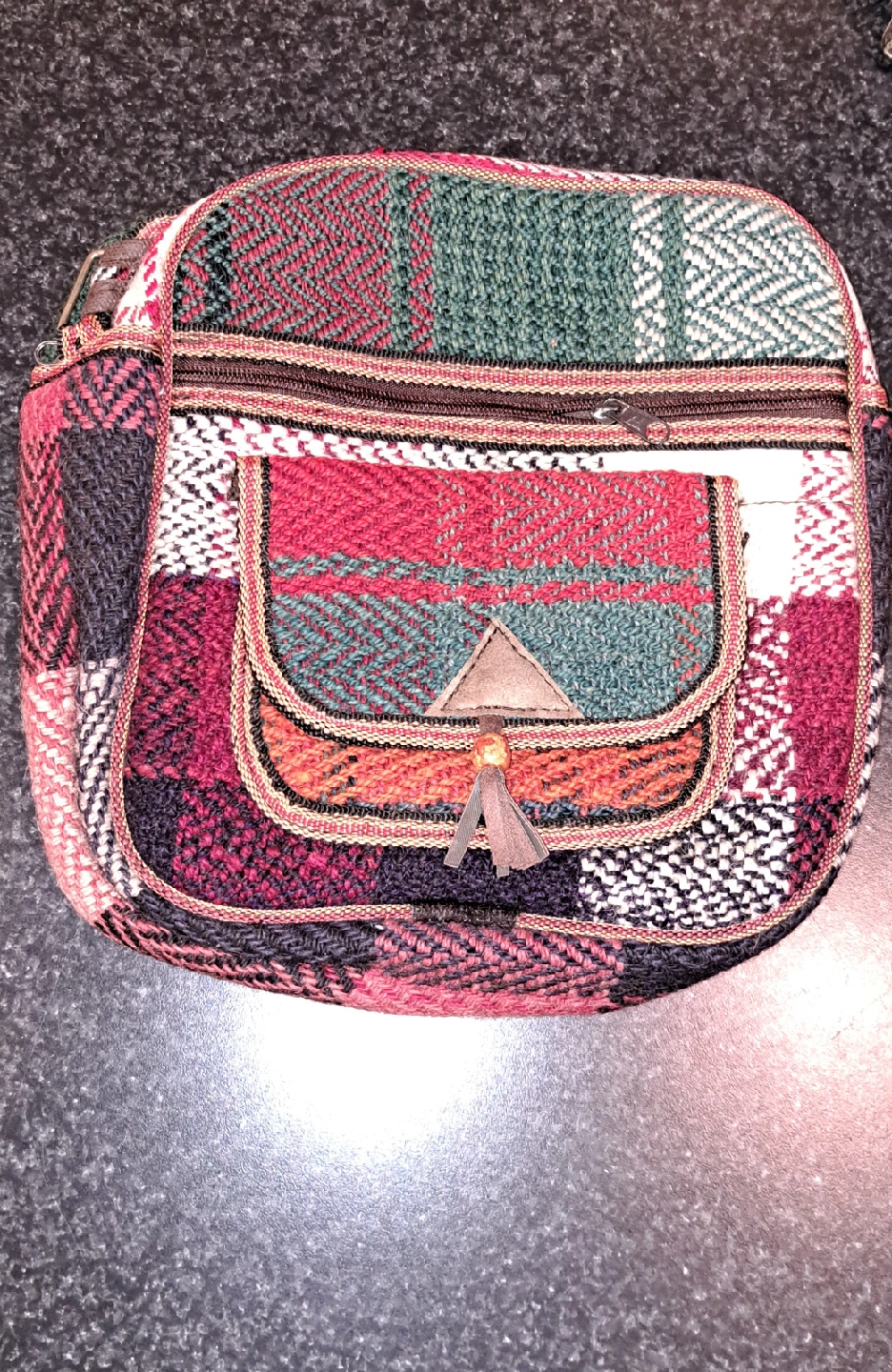 Here's a colourful woven crossbody bag! It has a front pocket and a long adjustable strap. It's in great condition and ready for a new home