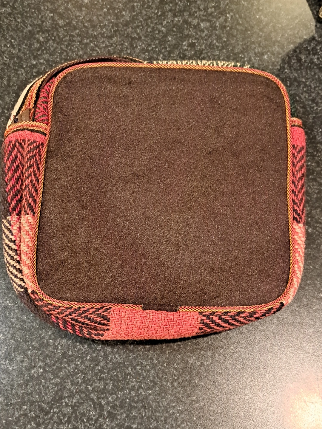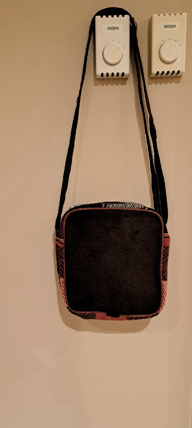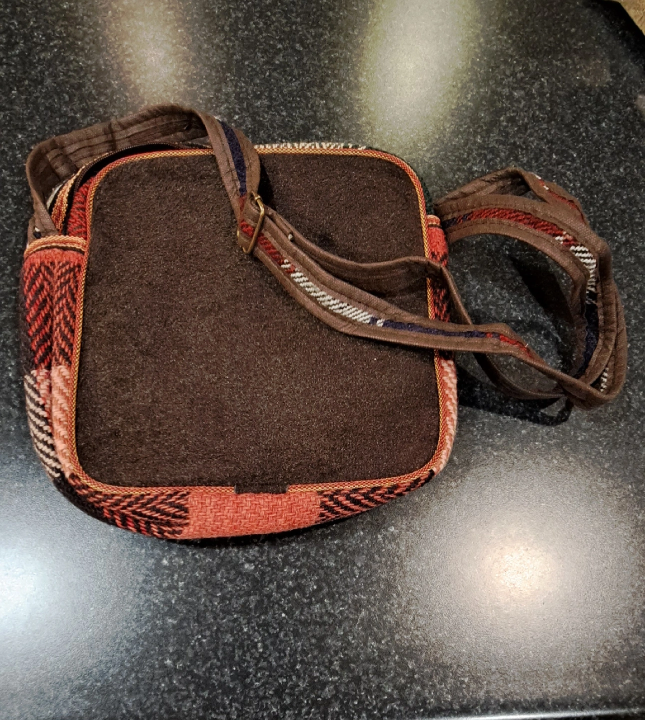 Here's a colourful woven crossbody bag! It has a front pocket and a long adjustable strap. It's in great condition and ready for a new home